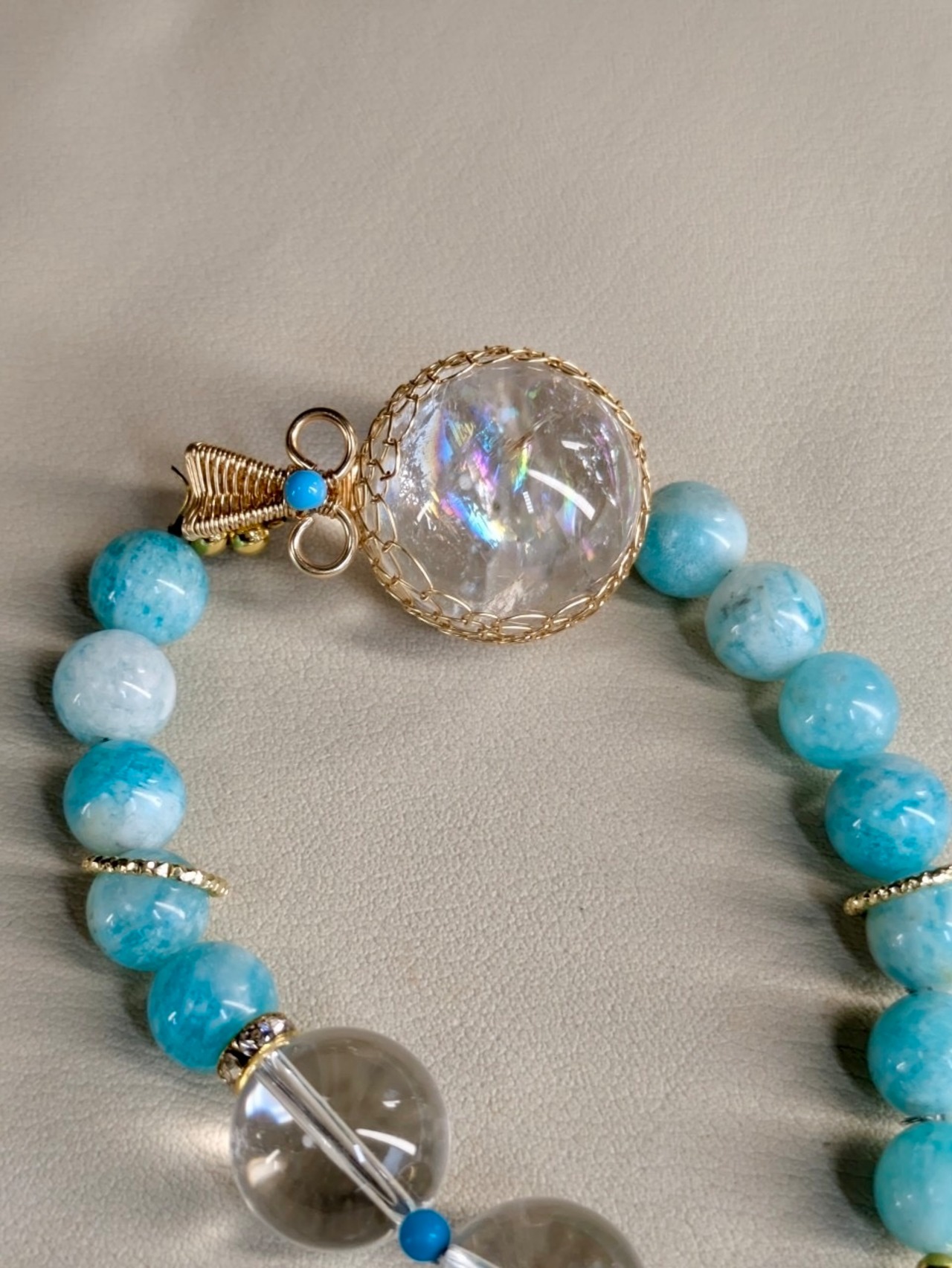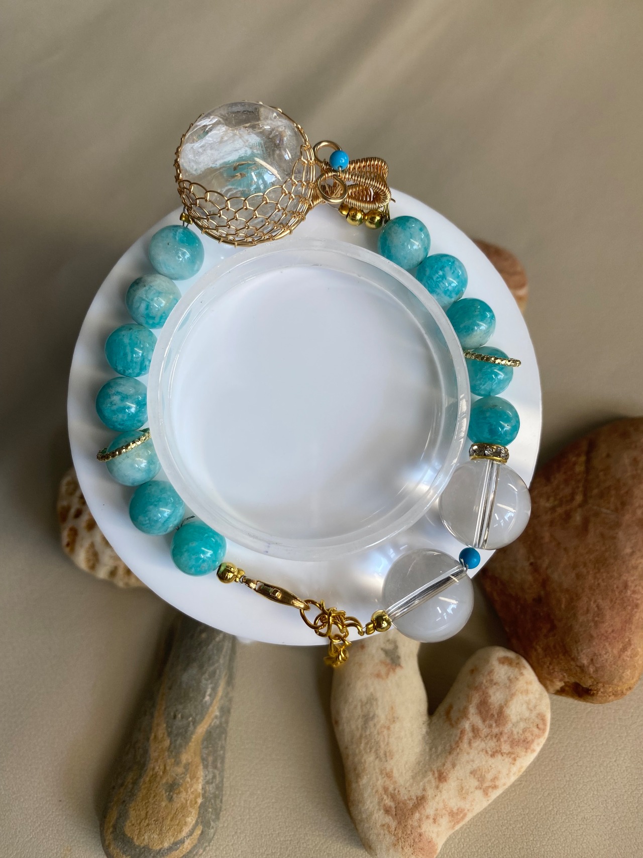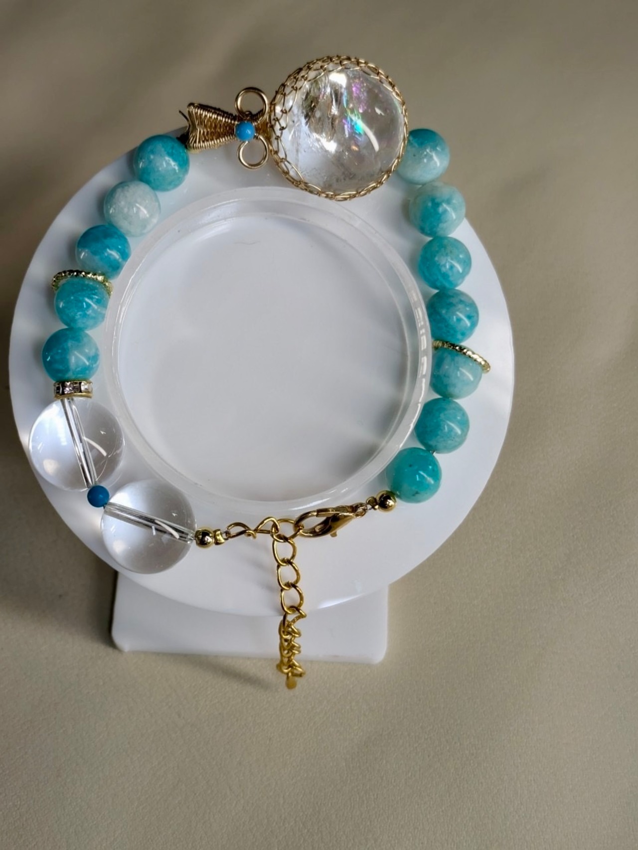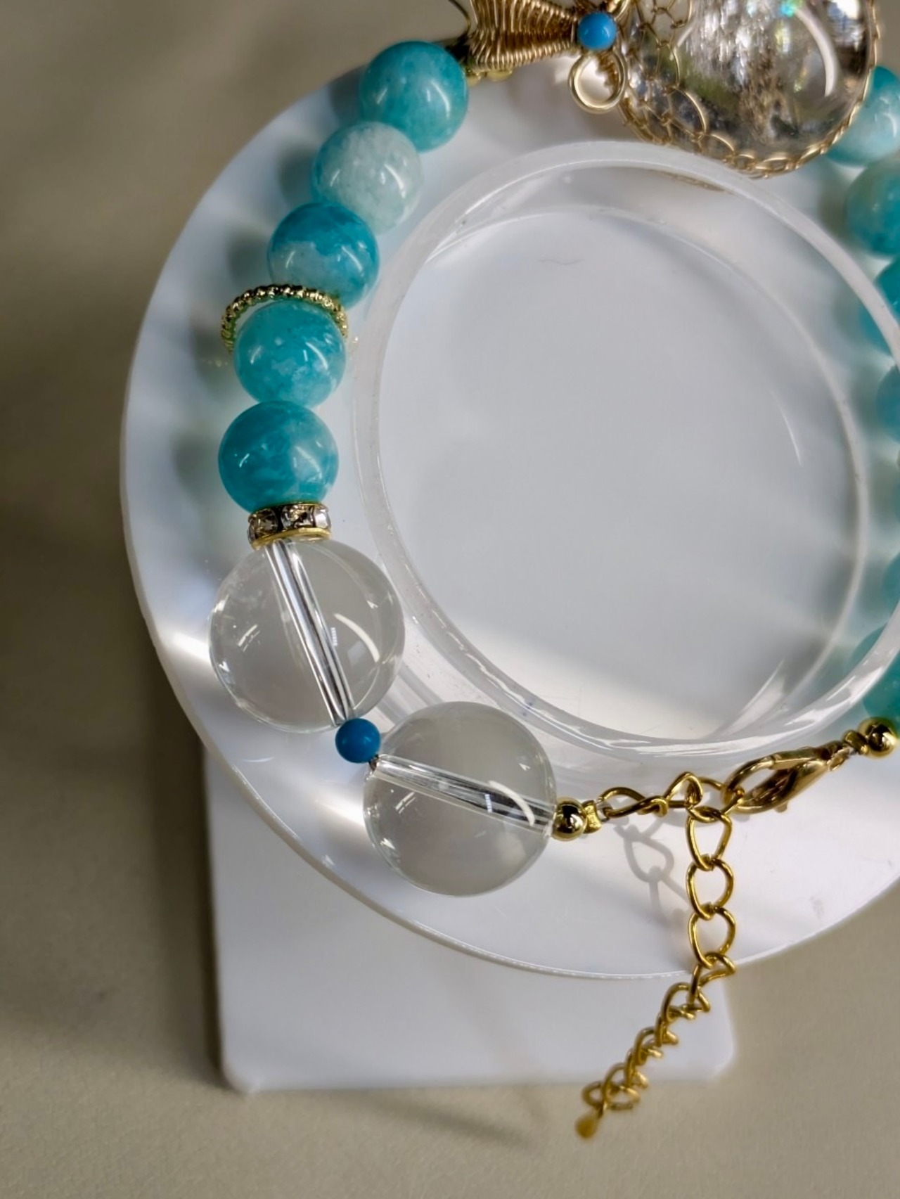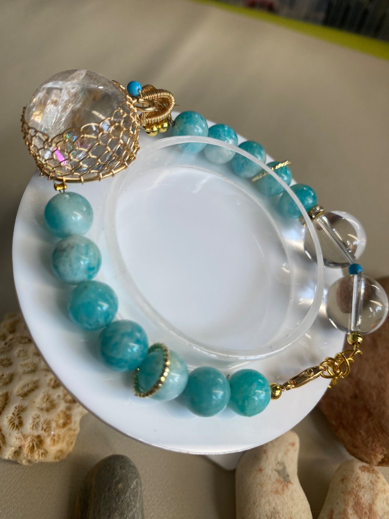 輝く青色のアマゾナイトが、水晶と組み合わさったブレスレットです。アマゾナイトは古代より愛され、幸運と癒しをもたらす石として知られています。青い色合いは心を穏やかにし、ストレスを和らげる効果があると言われています。水晶との組み合わせは、パワーが倍増し、更なる幸運を引き寄せる力を持ちます。