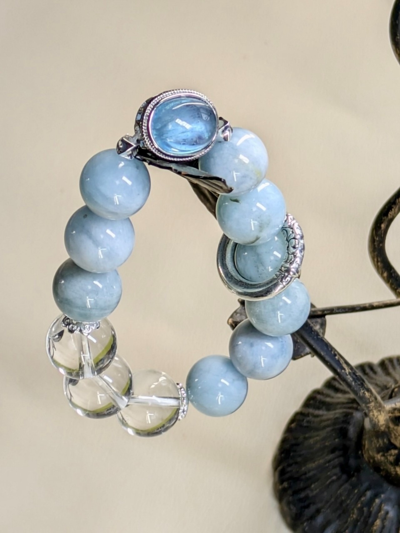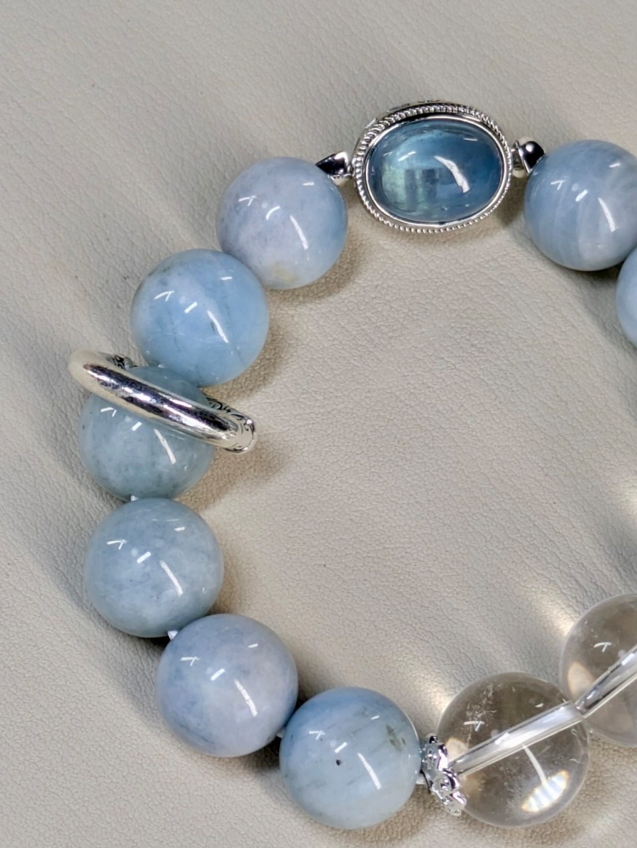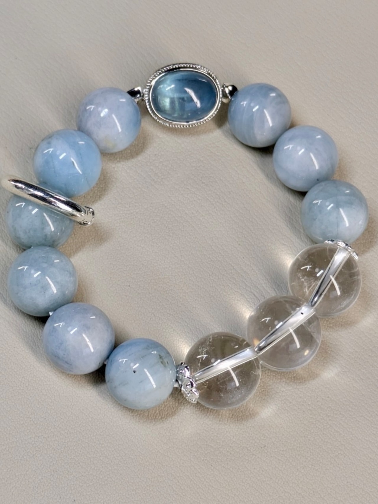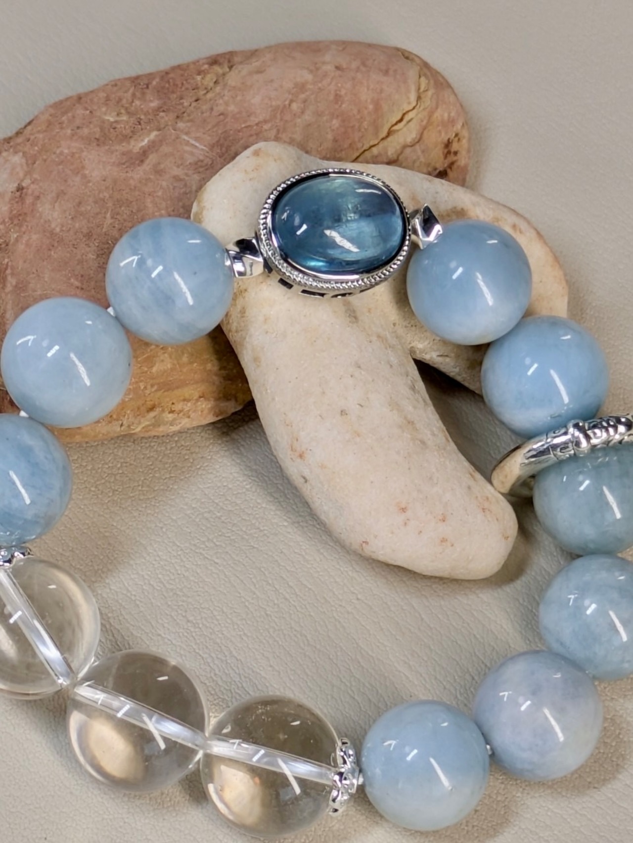 気持ちを和ませてくれるブルー系のブレスレットが登場しました。美しいフローライト、神秘的なアクアマリン、清浄な水晶が組み合わさったこのブレスレットは、日常生活に少しだけ魔法を添えてくれること間違いなし。手首を彩るシルバーのアクセントが、さりげなくオシャレ度をアップしてくれます。