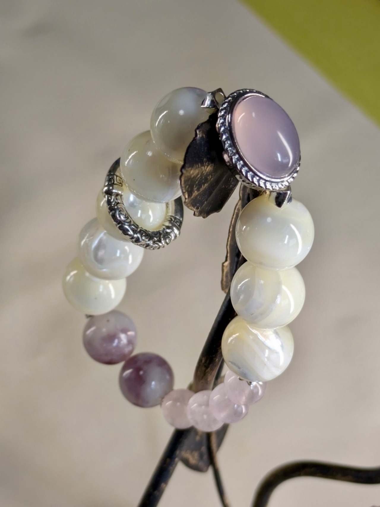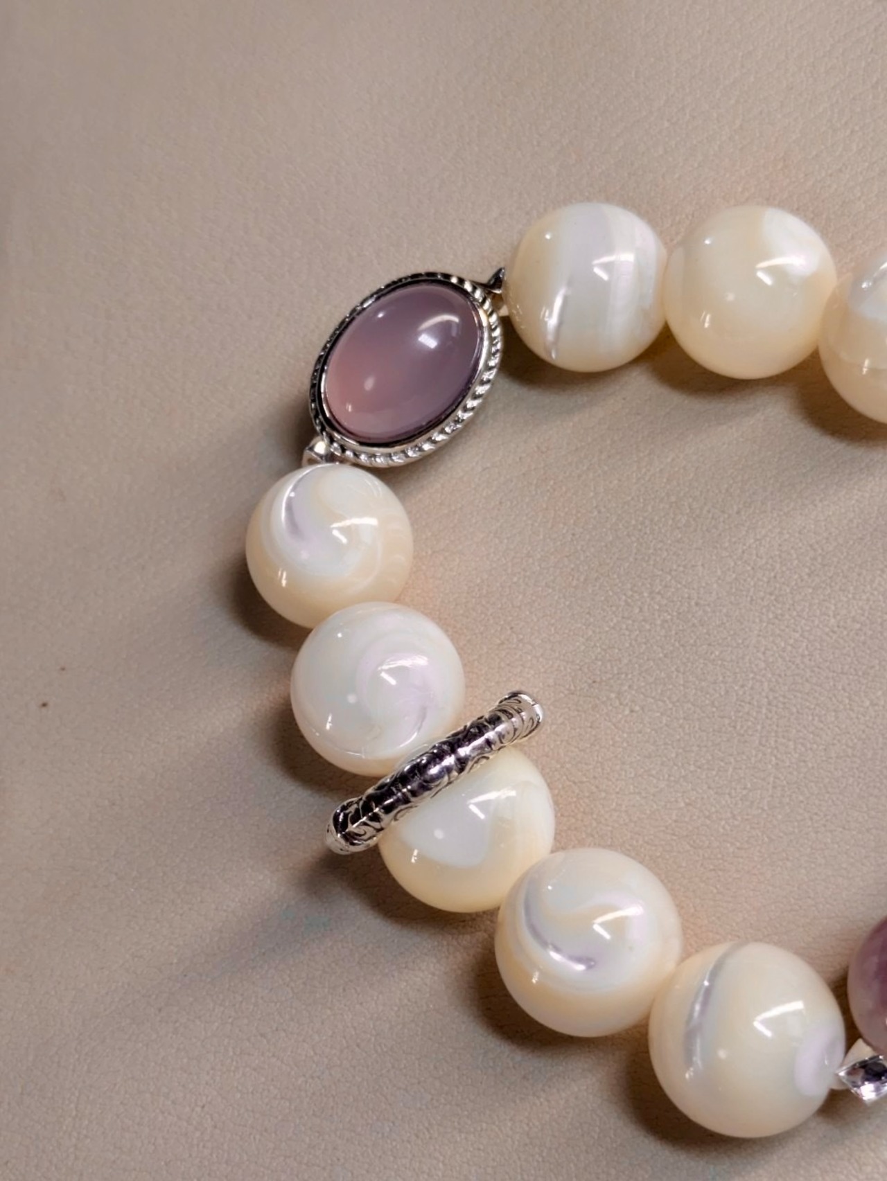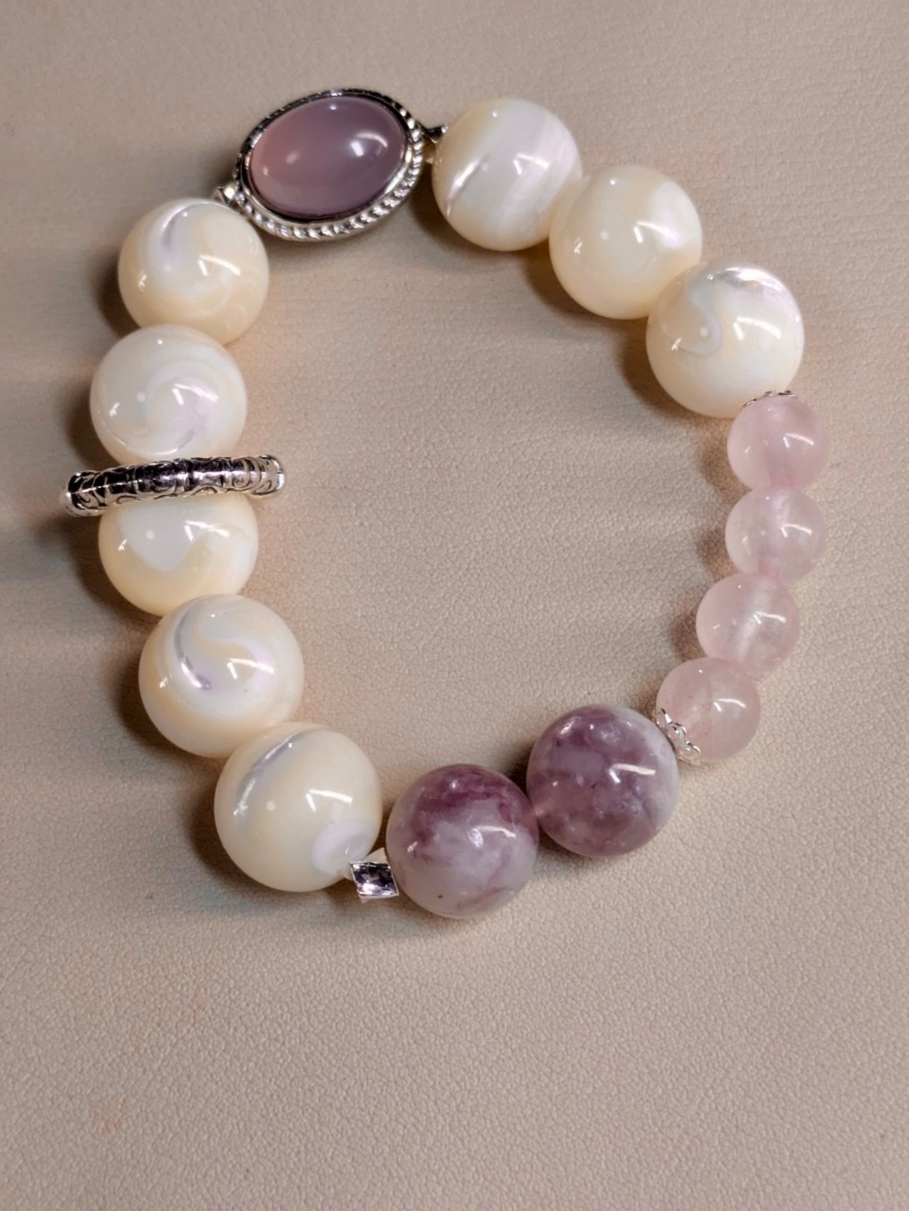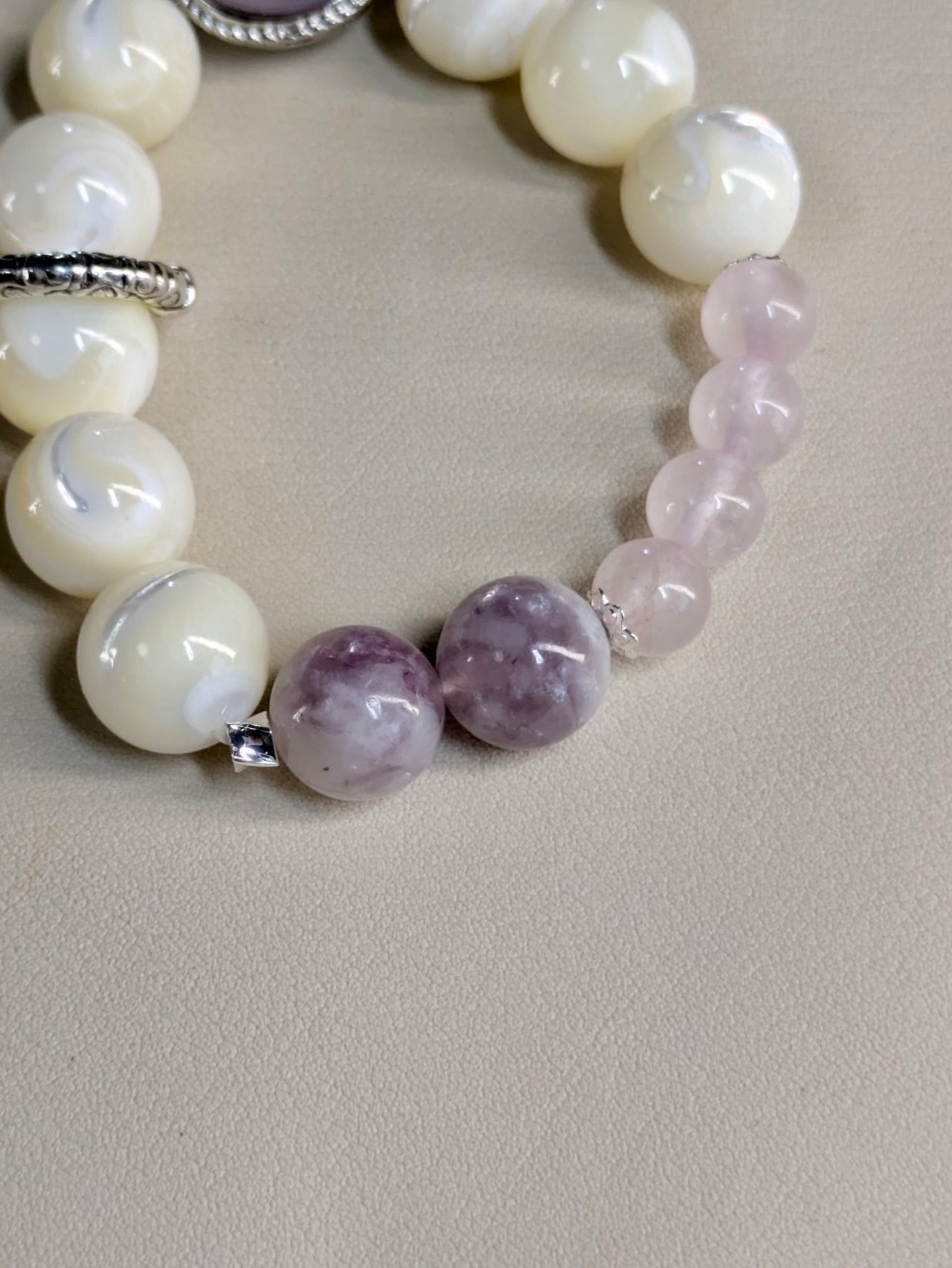 柔らかな光を放つピンクカルセドニー、淡い輝きのマザーオパール、優しいローズクオーツ、そして神秘的なパープルマイカ。この素敵なブレスレットは、その全てをひとつにまとめた贅沢な存在です。上品な紫と清らかな白が織り成す美しい組み合わせは、日常に暮らす女性に優しさと穏やかさをもたらしてくれることでしょう。何か自分へのご褒美や大切な方への贈り物に、このブレスレットを選んでみてはいかがでしょうか。