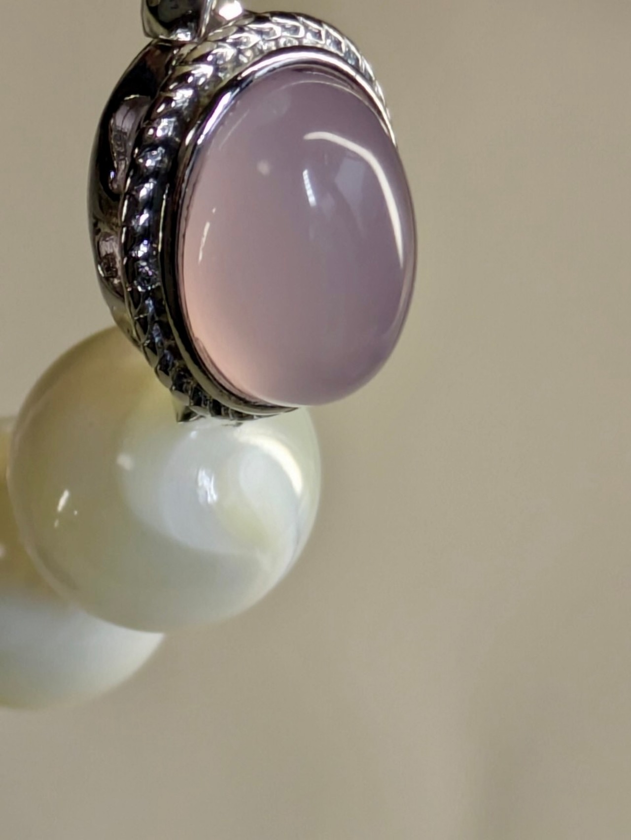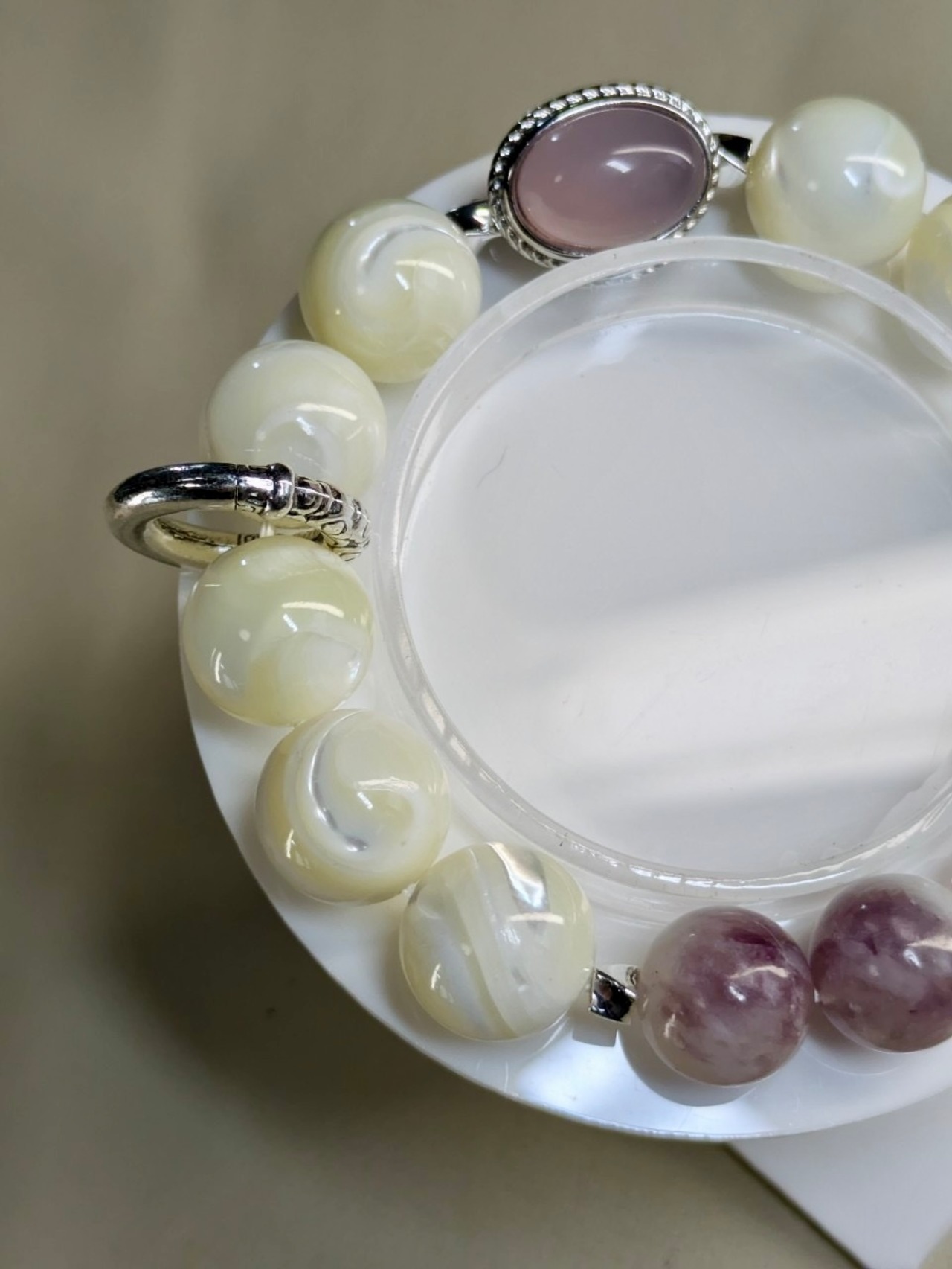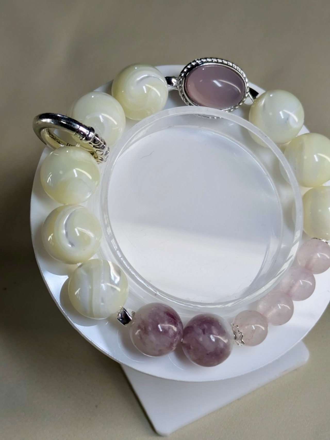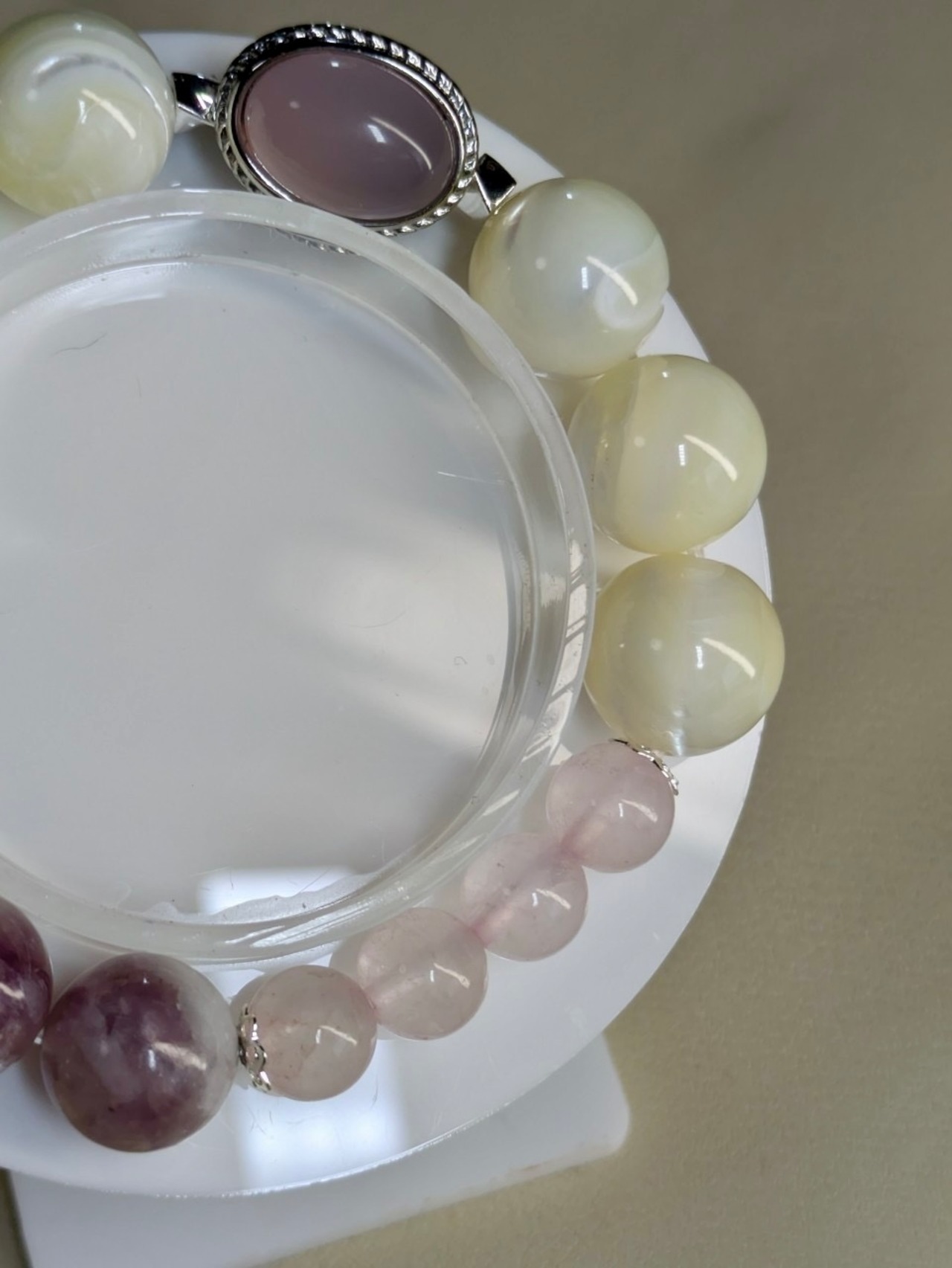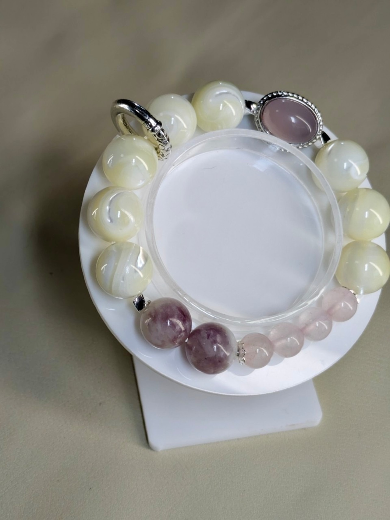 柔らかな光を放つピンクカルセドニー、淡い輝きのマザーオパール、優しいローズクオーツ、そして神秘的なパープルマイカ。この素敵なブレスレットは、その全てをひとつにまとめた贅沢な存在です。上品な紫と清らかな白が織り成す美しい組み合わせは、日常に暮らす女性に優しさと穏やかさをもたらしてくれることでしょう。何か自分へのご褒美や大切な方への贈り物に、このブレスレットを選んでみてはいかがでしょうか。