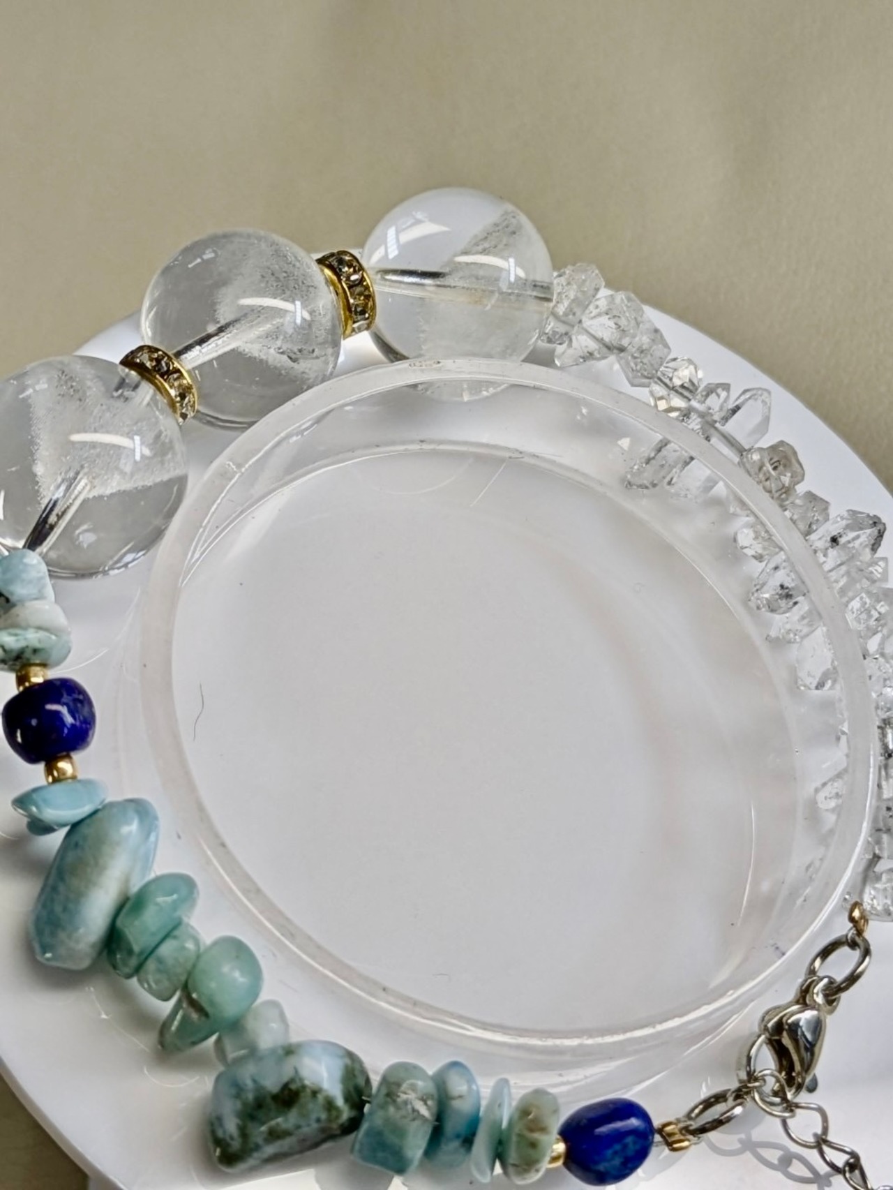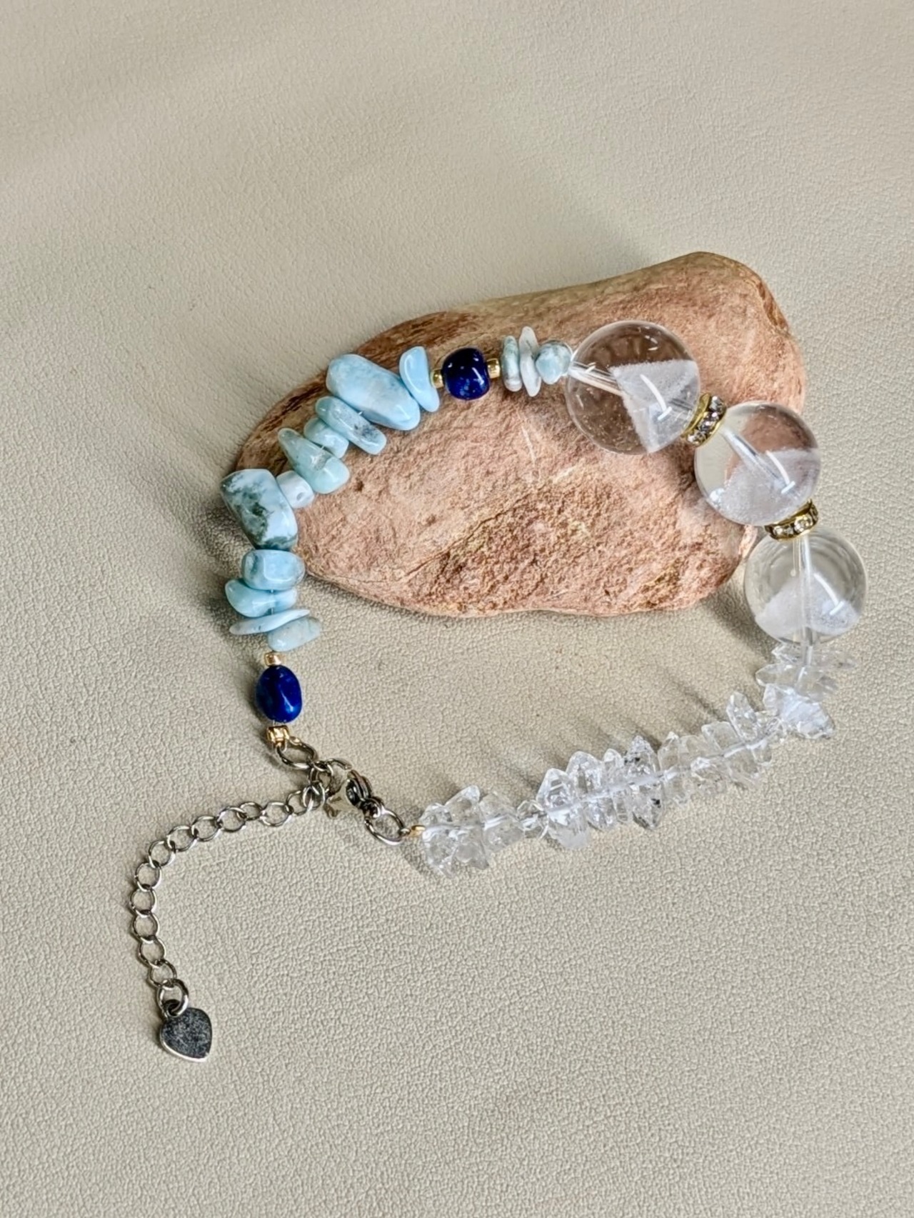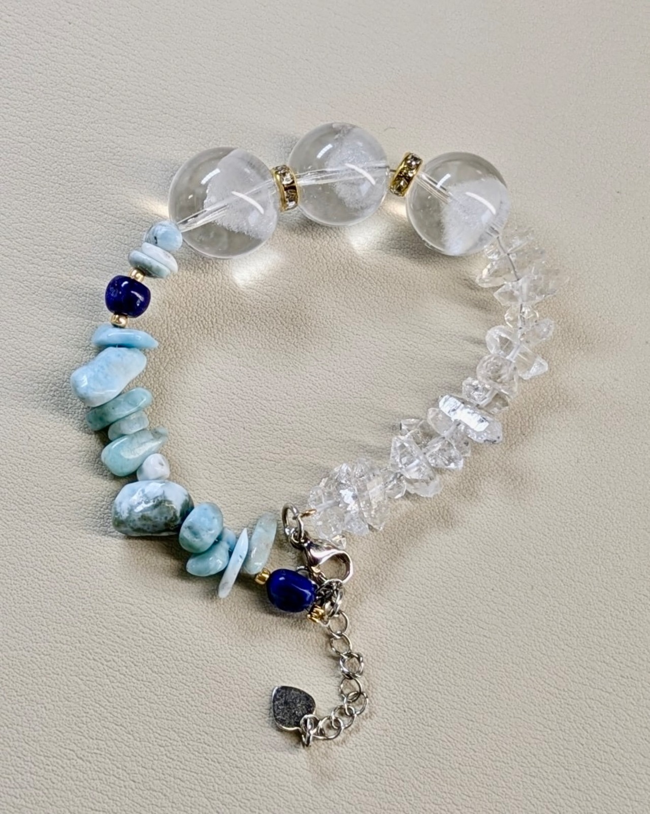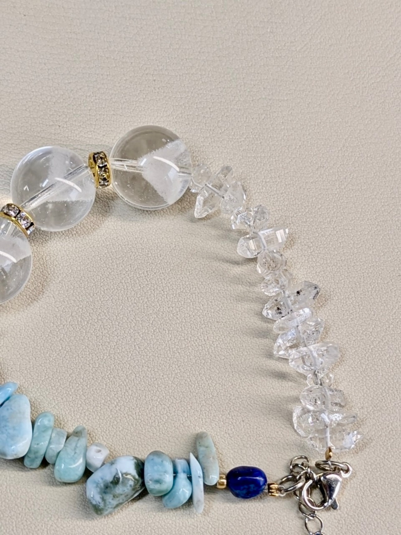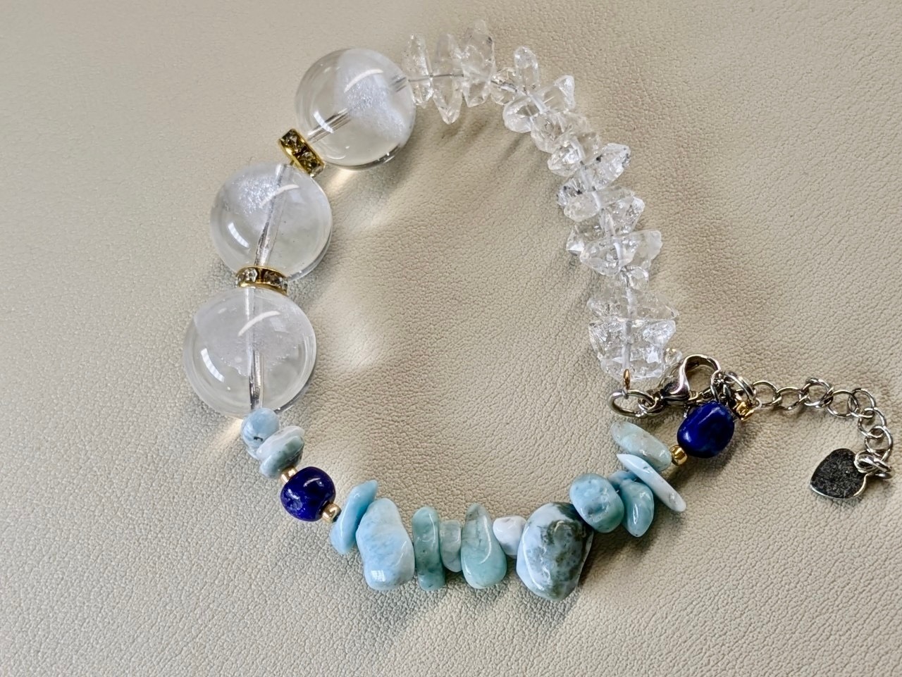 ラリマー、ハーキマーダイヤモンド、ラピスラズリ、水晶を組み合わせたブレスレット。美しいブルーカラーと透明感が魅力の一点物です。このブレスレットは、パワーストーンの持つエネルギーを感じながら、身につけることで自己表現や内面の輝きを引き出すお守りとして最適です。