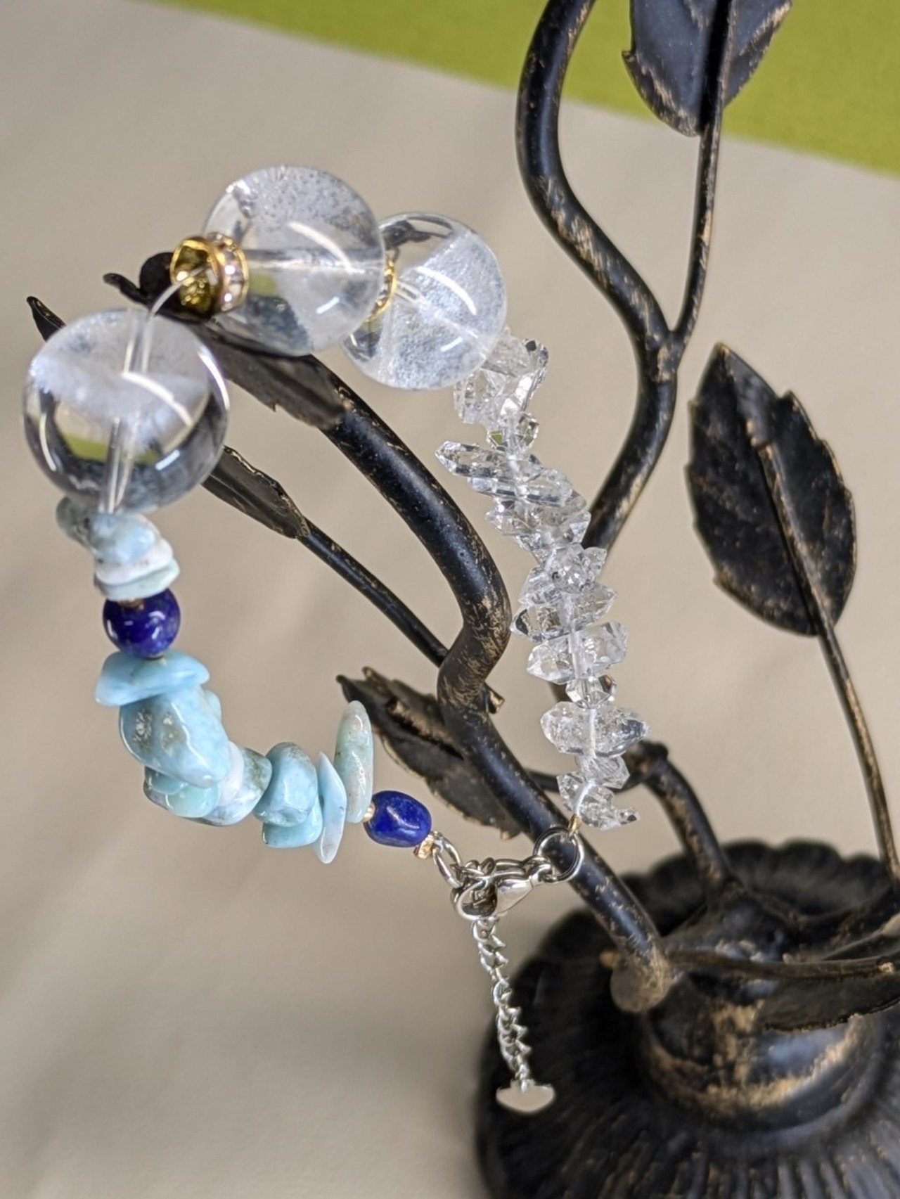 ラリマーの穏やかなエネルギー、ハーキマーダイヤモンドの浄化作用、ラピスラズリの知性とインスピレーション、水晶のクリアなエネルギーが、毎日のサポートとなります。