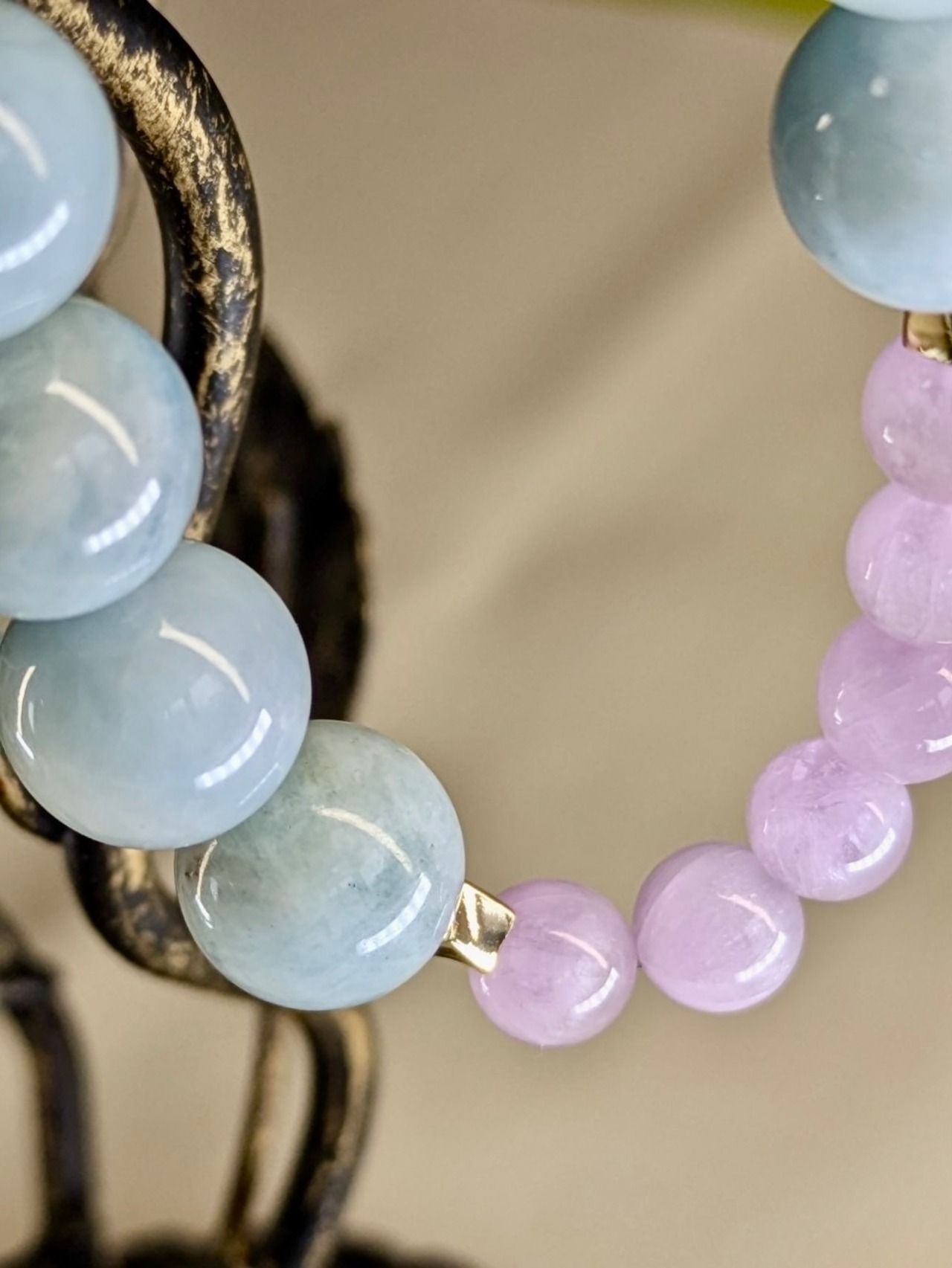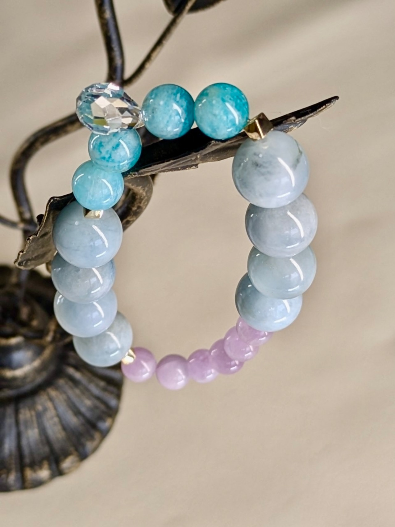 このクゥンツァイト、アクアマリン、アマゾナイト、水晶が織りなすブレスレットは、穏やかで美しい色合いが特徴のアクセサリーです。クゥンツァイトの優しいピンク、アクアマリンの透明感あるブルー、アマゾナイトの爽やかなグリーン、そして水晶の輝きが、手元を華やかに彩ります。