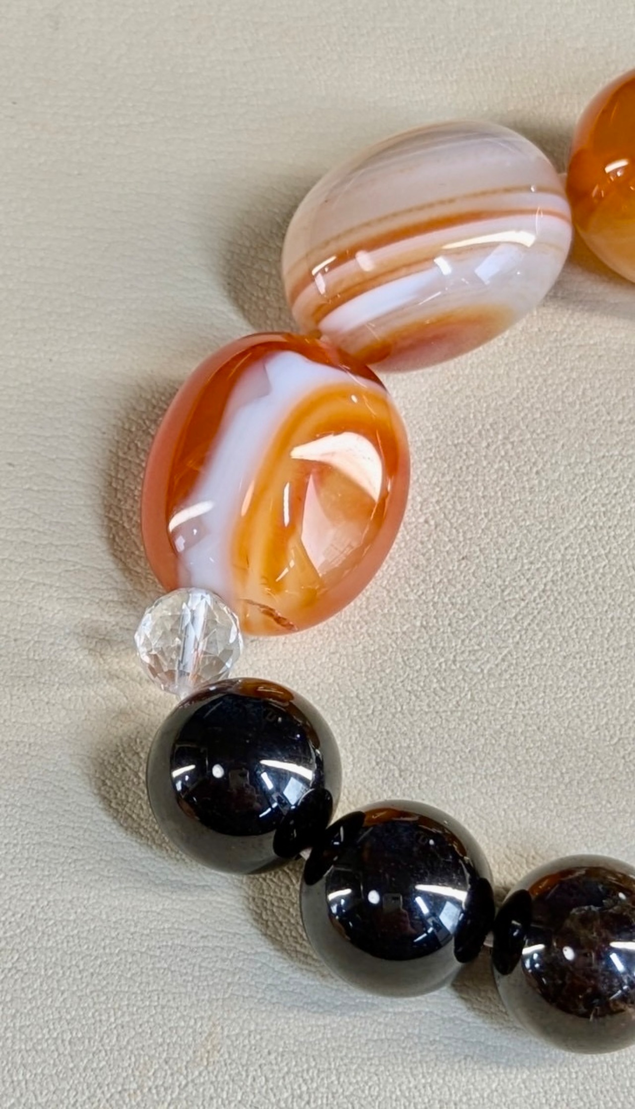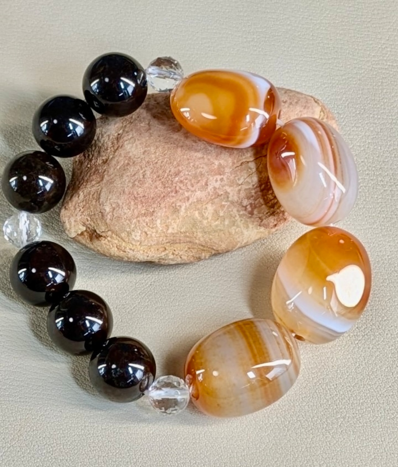 瑪瑙、ガーネット、水晶のパワーストーンが贅沢に使われたブレスレット。瑪瑙は根気や忍耐力を養ってくれ、ガーネットはパワーを高め、水晶は浄化作用があるとされています。これらの石が組み合わさったブレスレットは、身につけるだけでパワフルなサポートを受けられることでしょう。
