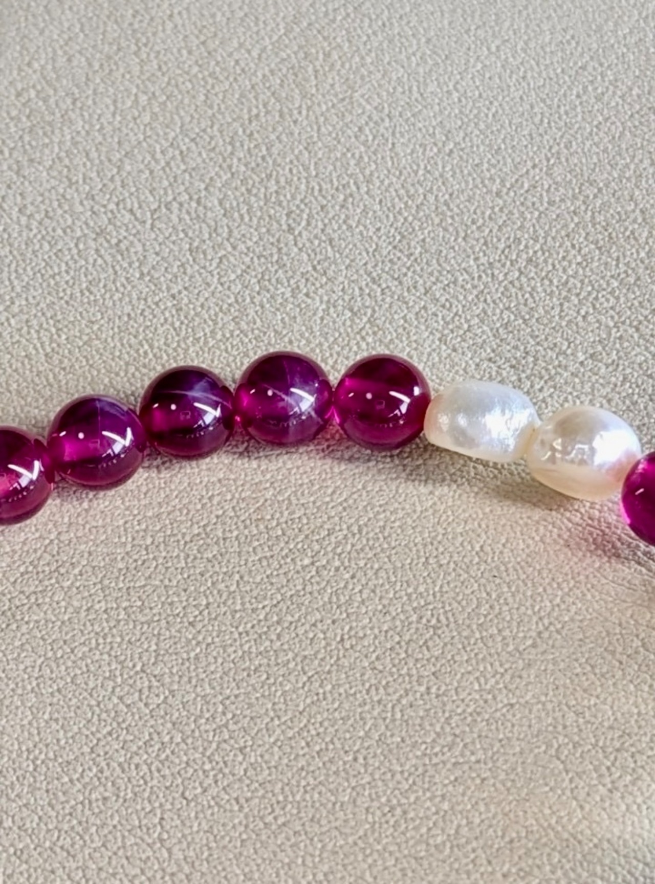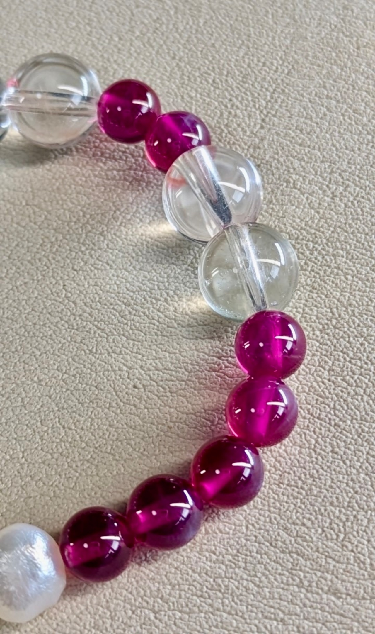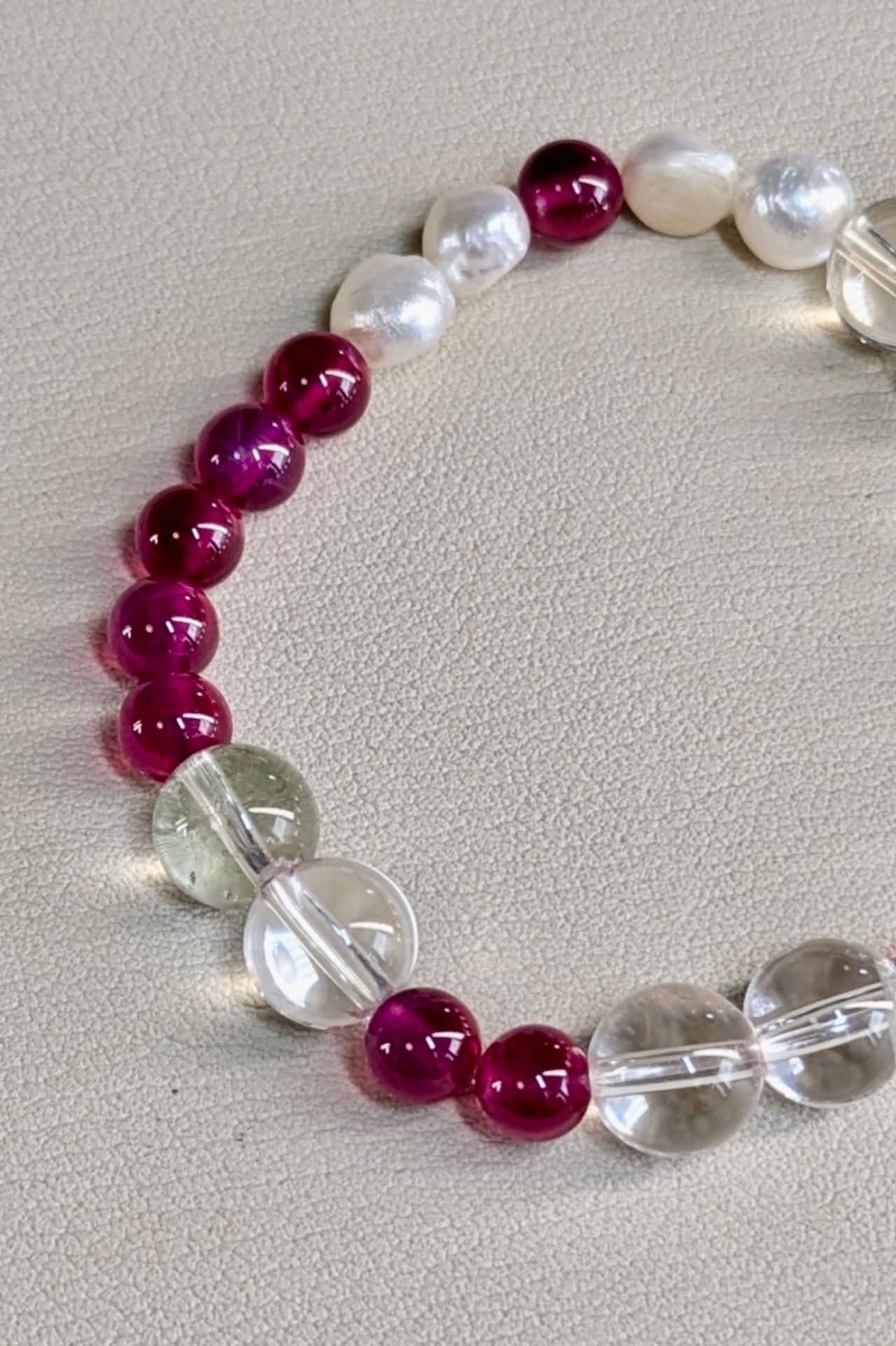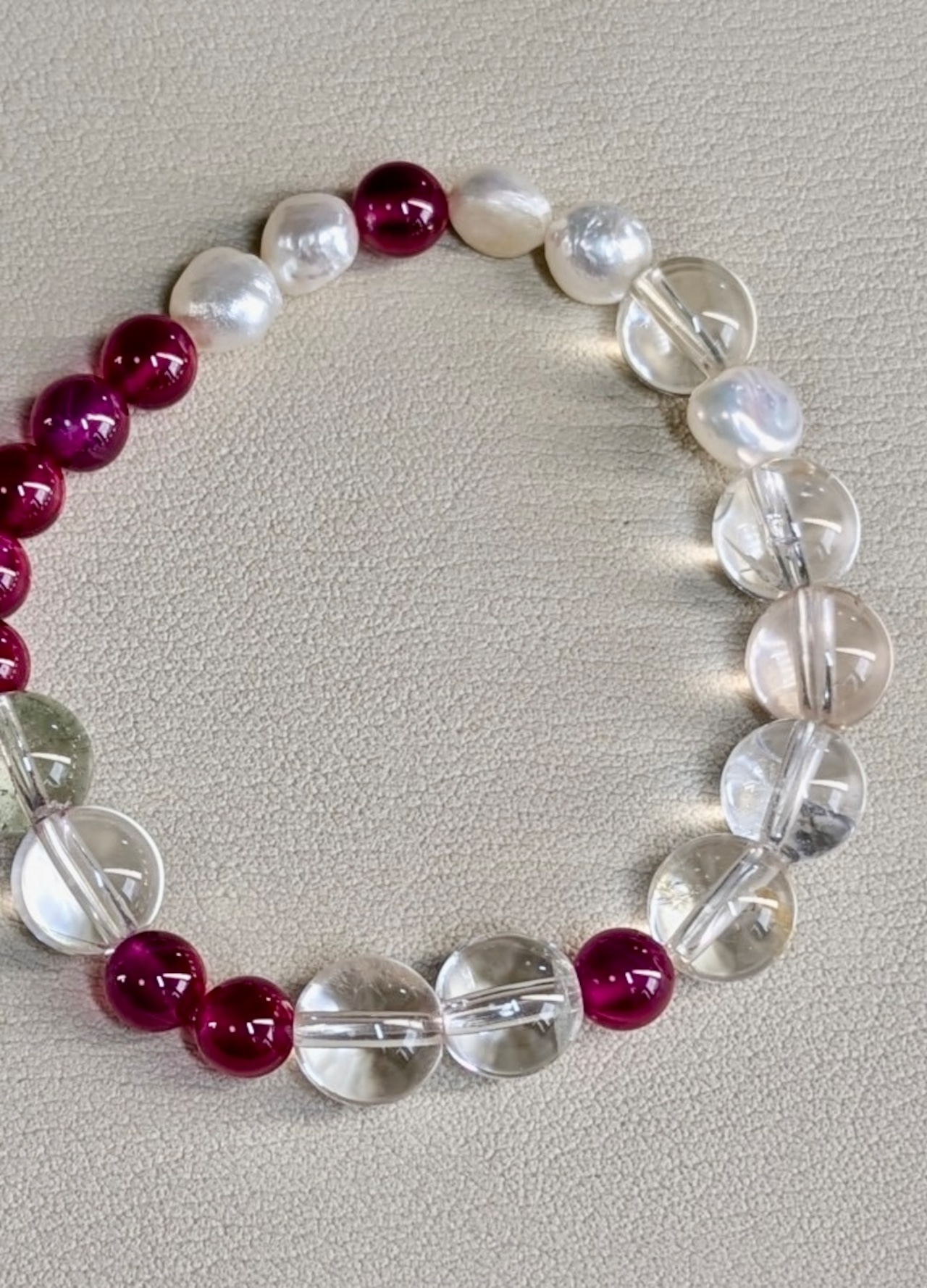 スタールビー、淡水パール、水晶が美しく輝くブレスレット。上品な輝きと優しい色合いが、あなたの腕元を彩ります。深い意味を持つパワーストーンが、日常に幸せや活力を運んできます。人気の組み合わせでオシャレ感も抜群です。何重にも巻き付けることで、華やかさをプラス。自信を持って輝けるよう、あなたを支えてくれるアクセサリーです。