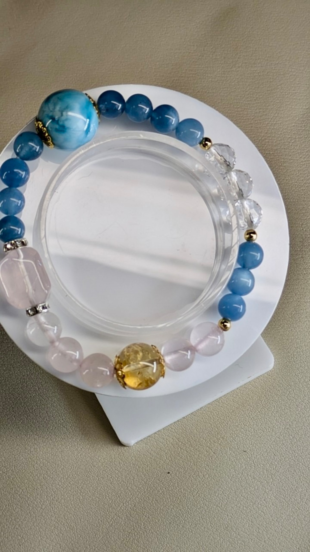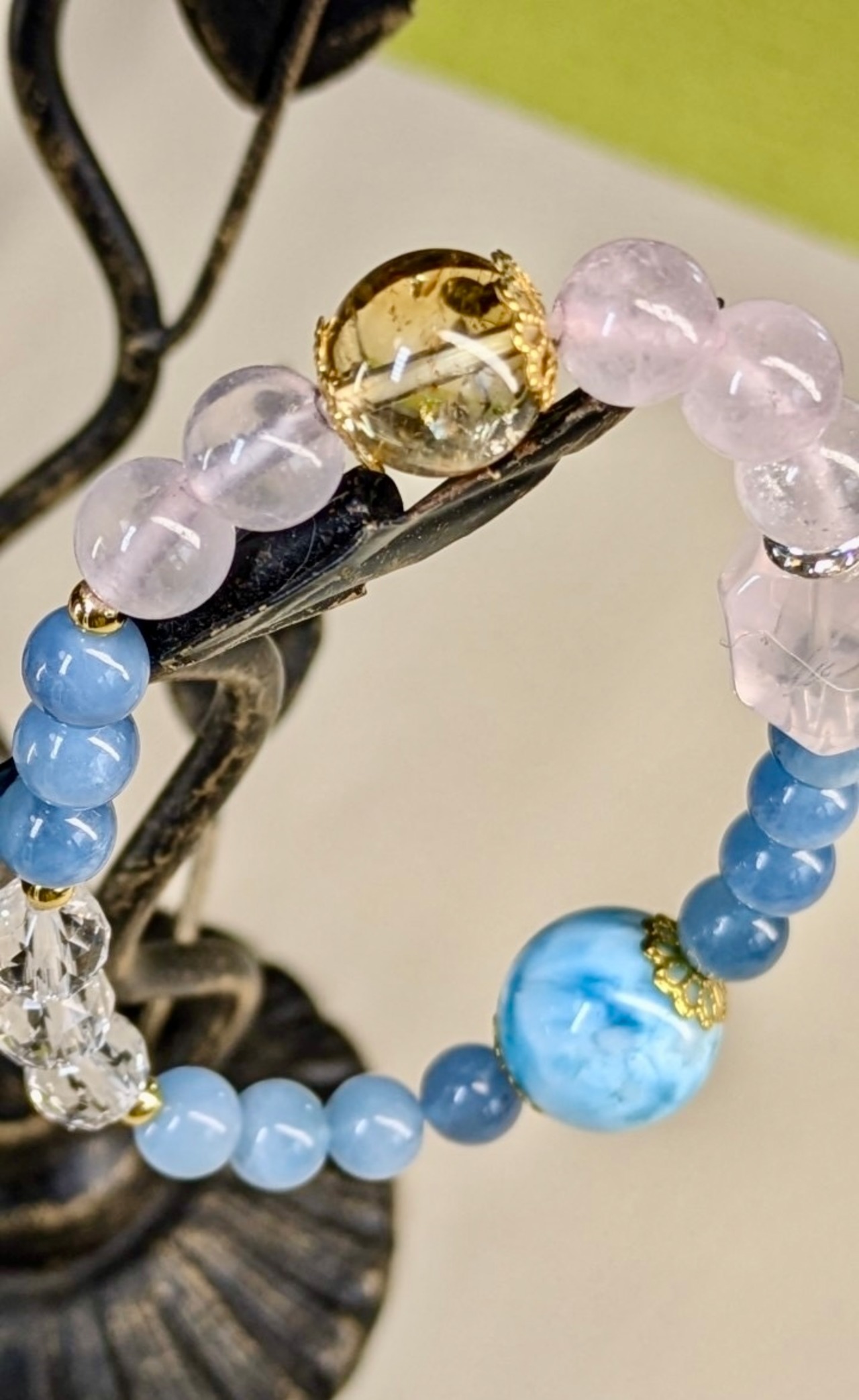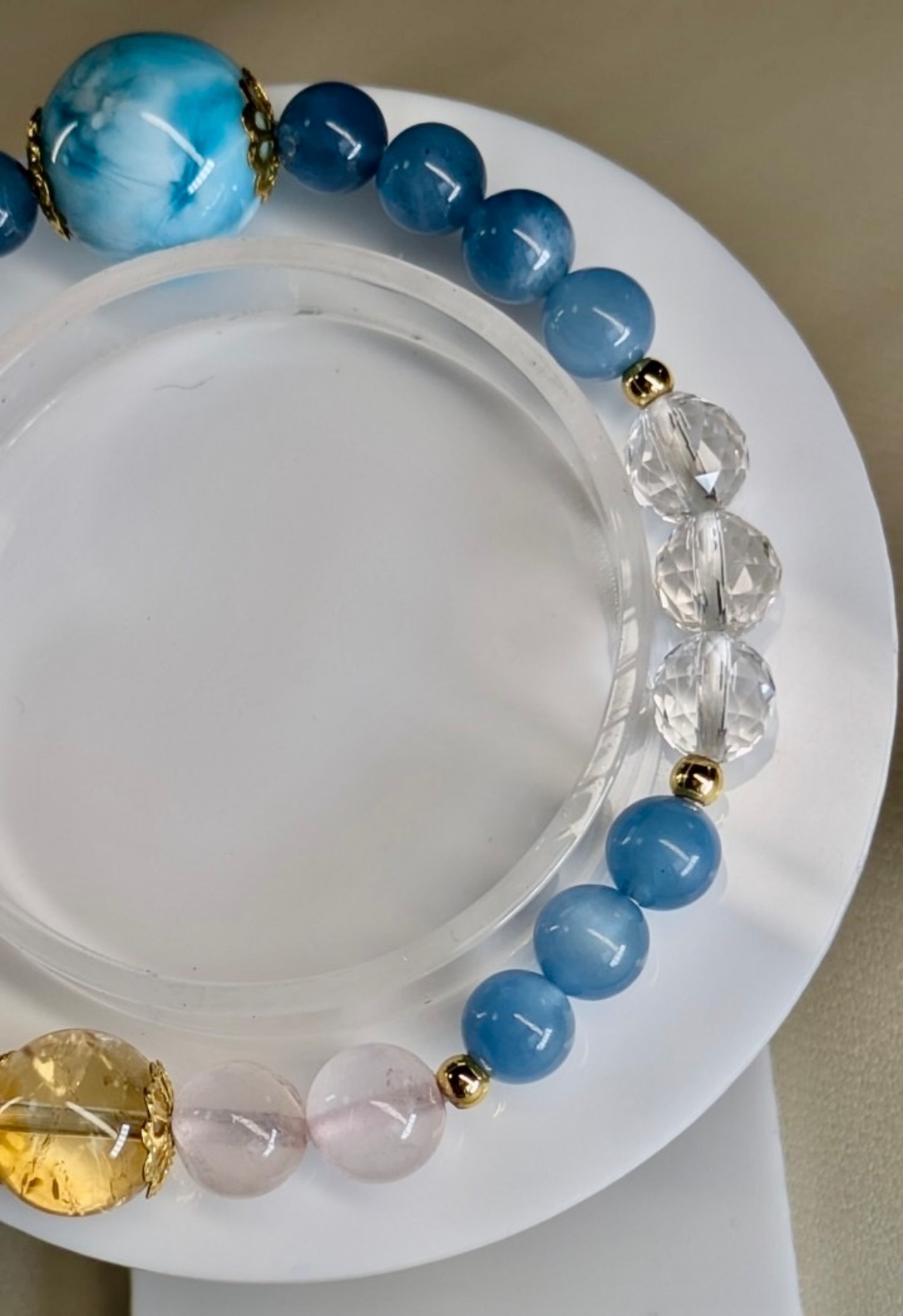 ラリマーの優しいブルーが癒しと安定をもたらし、シトリンの明るいイエローが豊かな幸福をサポート。