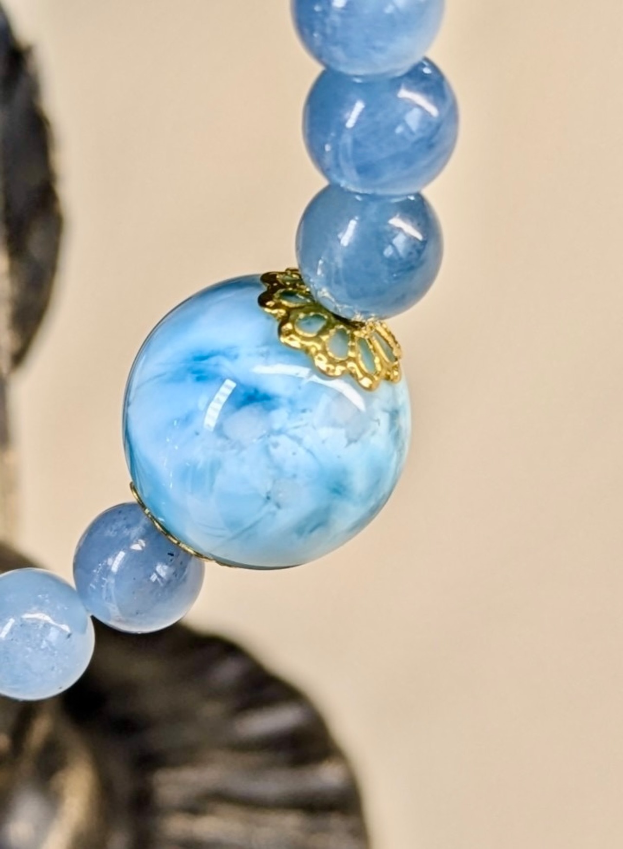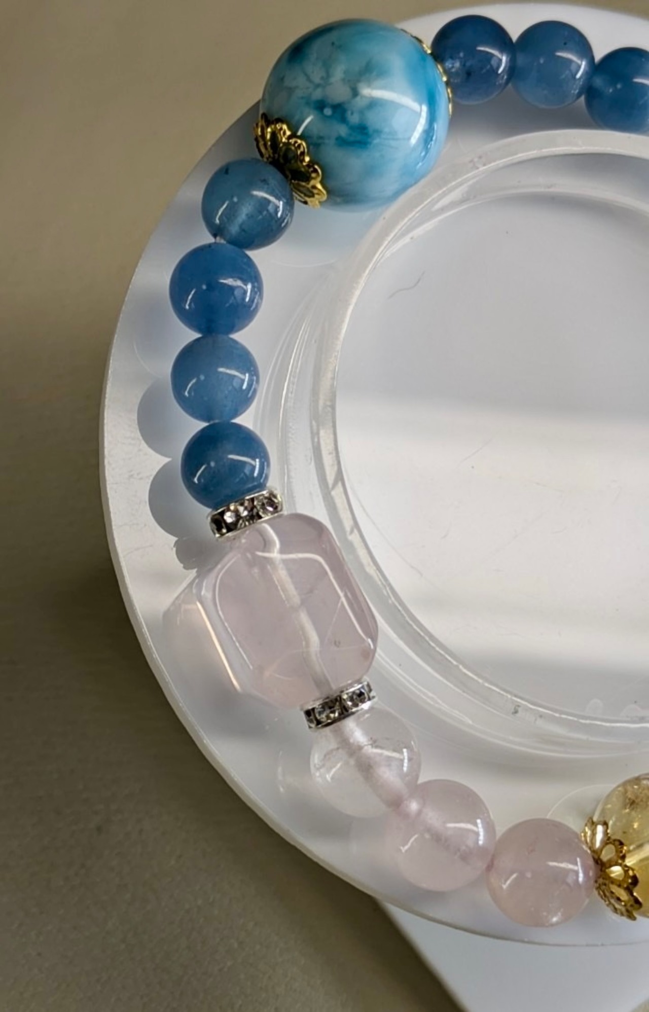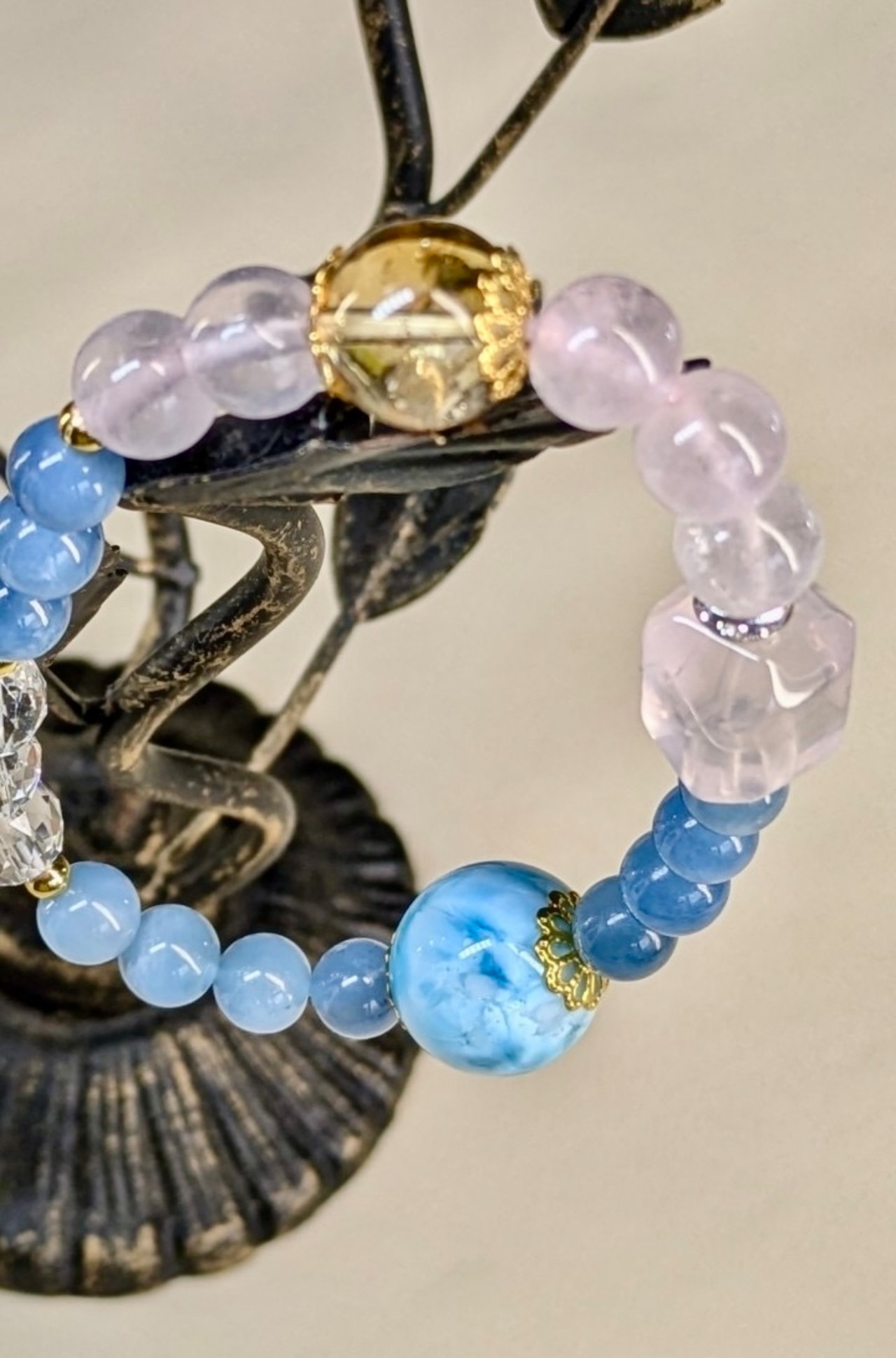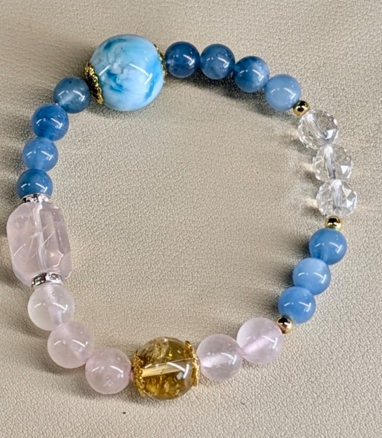 ラリマーの優しいブルーが癒しと安定をもたらし、シトリンの明るいイエローが豊かな幸福をサポート。