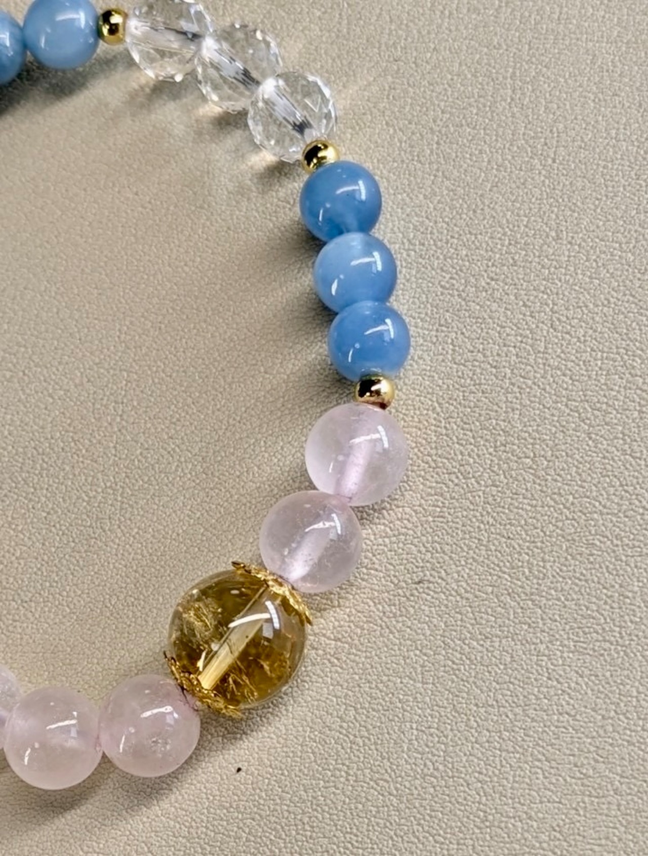 アクアマリン、水晶、ローズクォーツがそれぞれの持つパワーを重ね合わせ、あなたの心身を包み込みます。