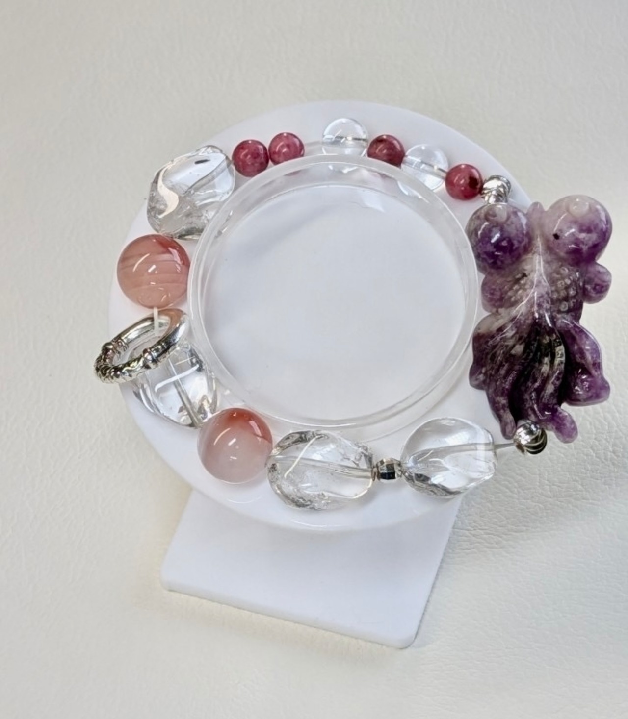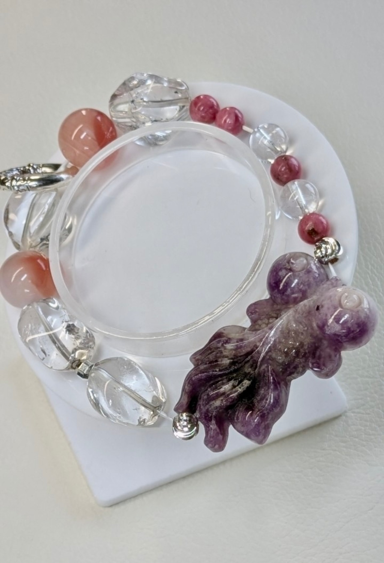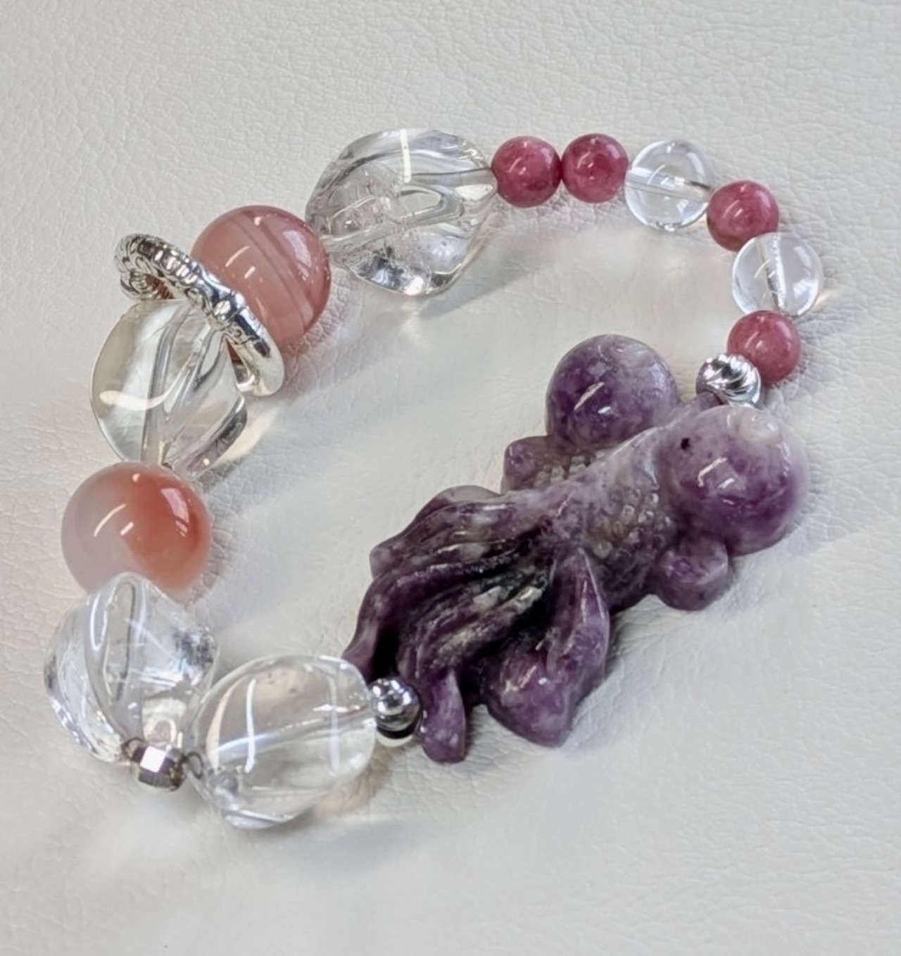 幸運が引き寄せられる金魚モチーフのレピトライト水晶、ロードナイト、瑪瑙ブレスレット。