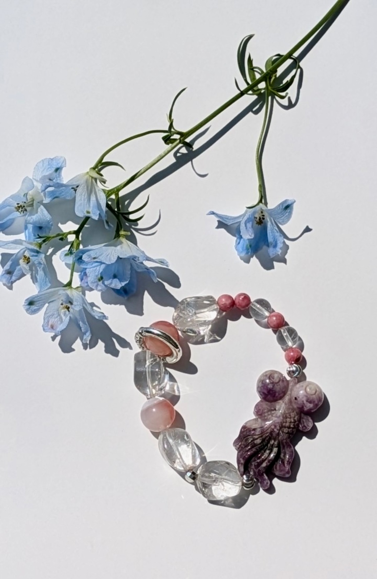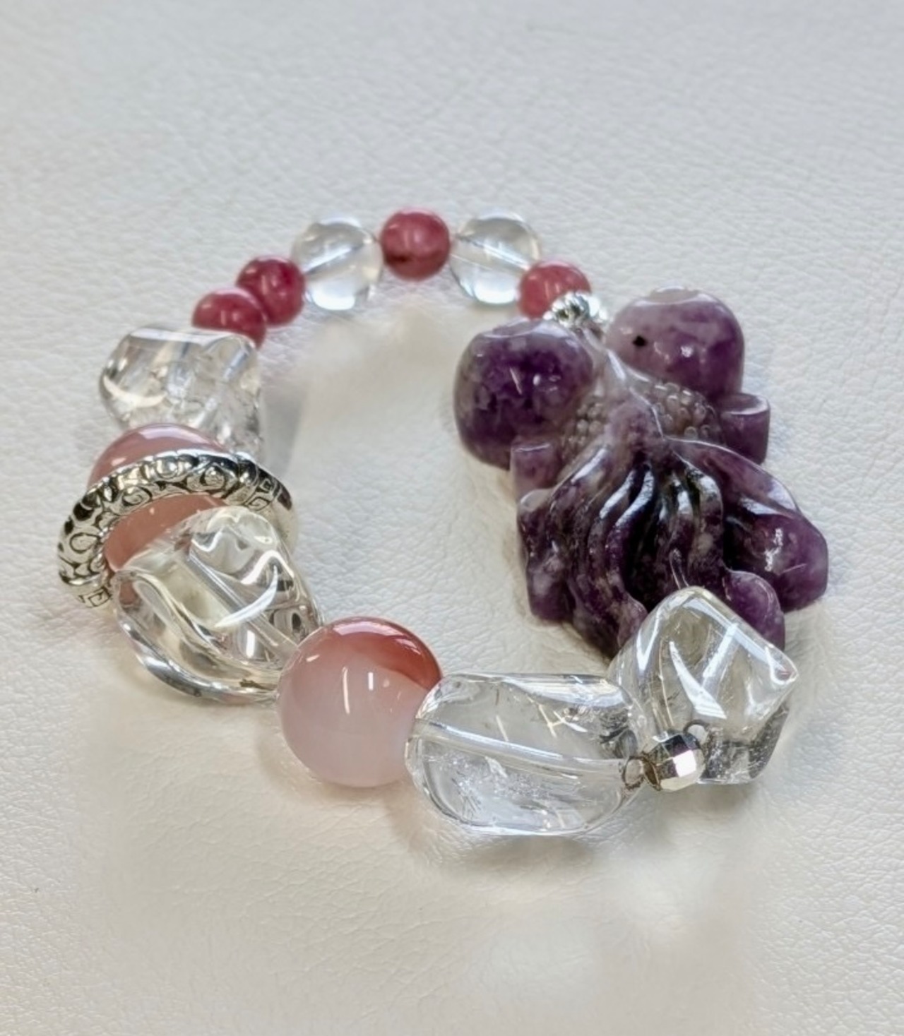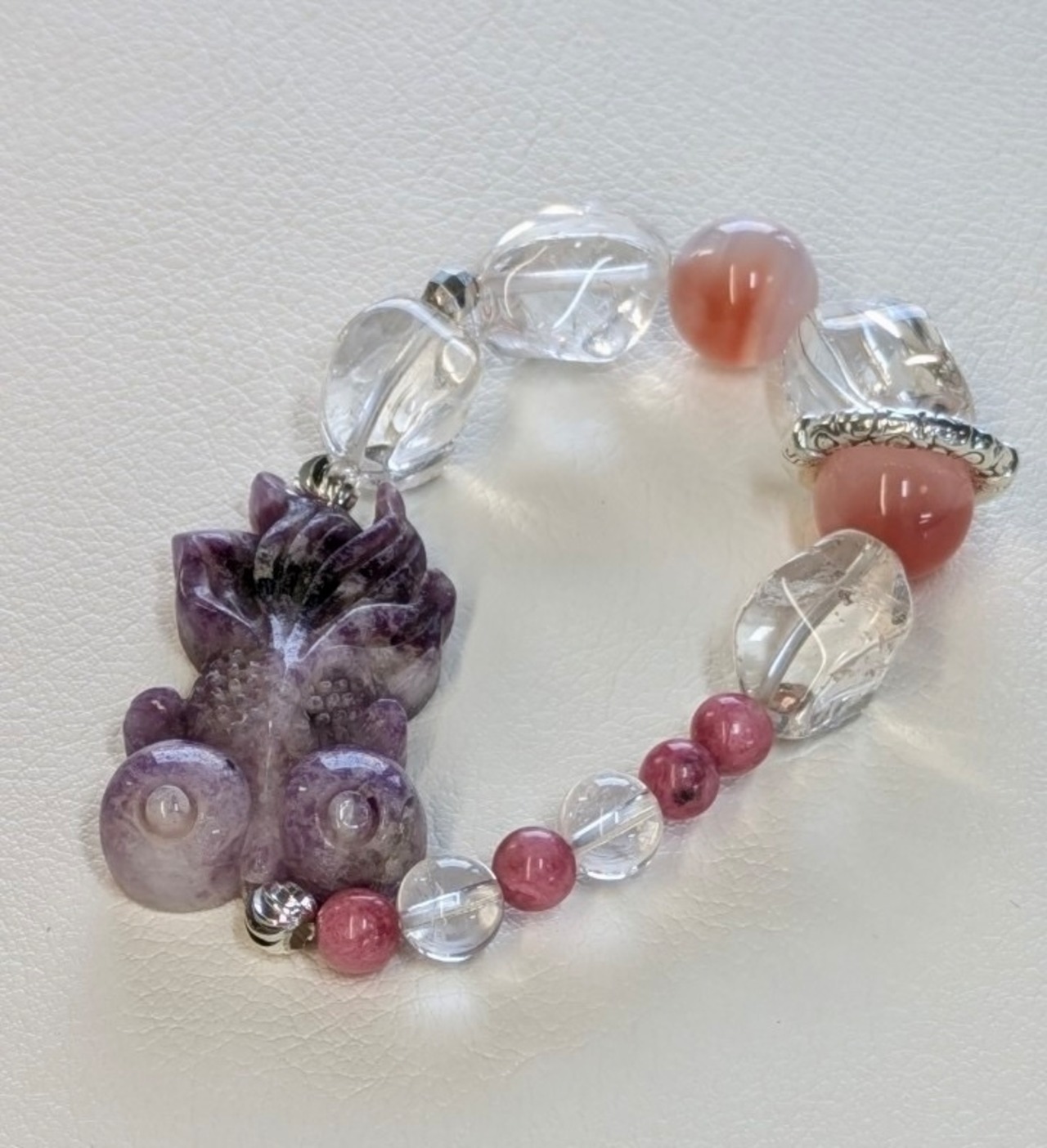 幸運が引き寄せられる金魚モチーフのレピトライト水晶、ロードナイト、瑪瑙ブレスレット。