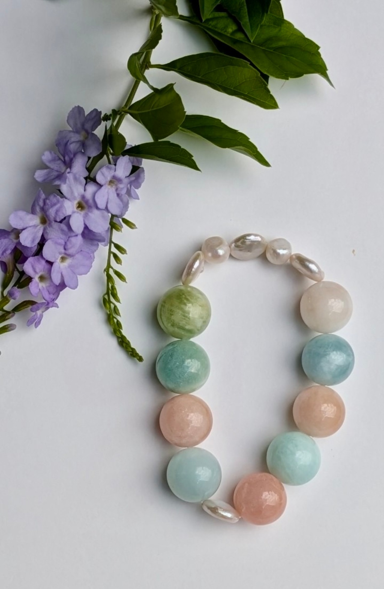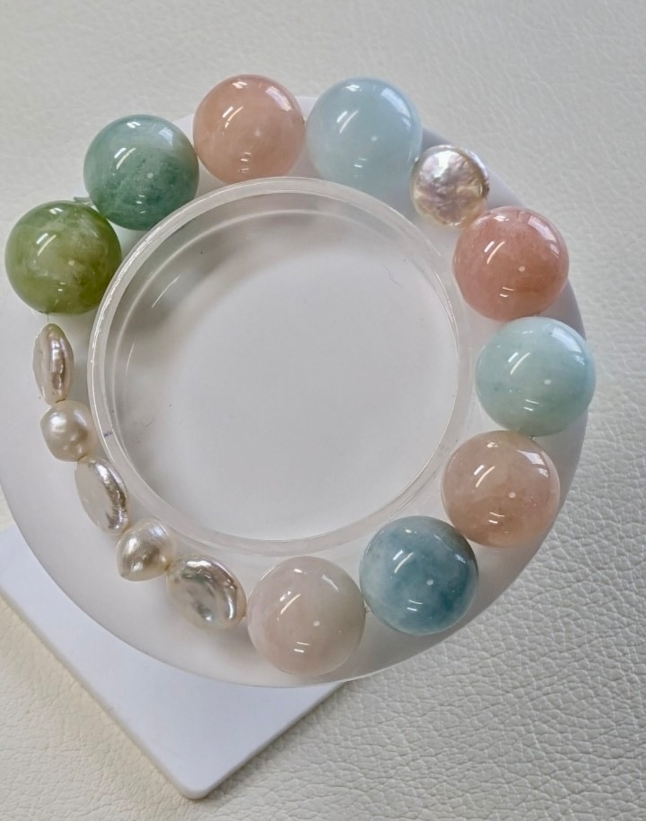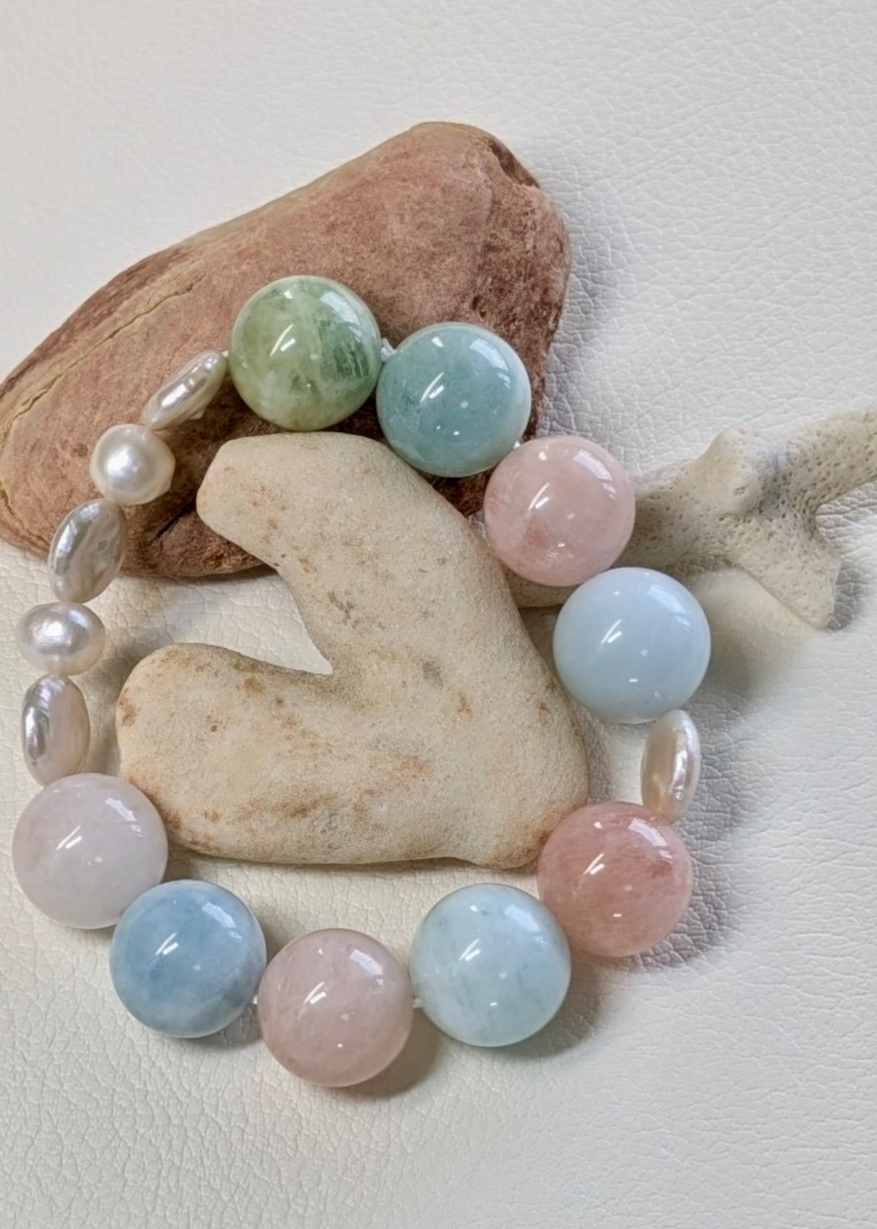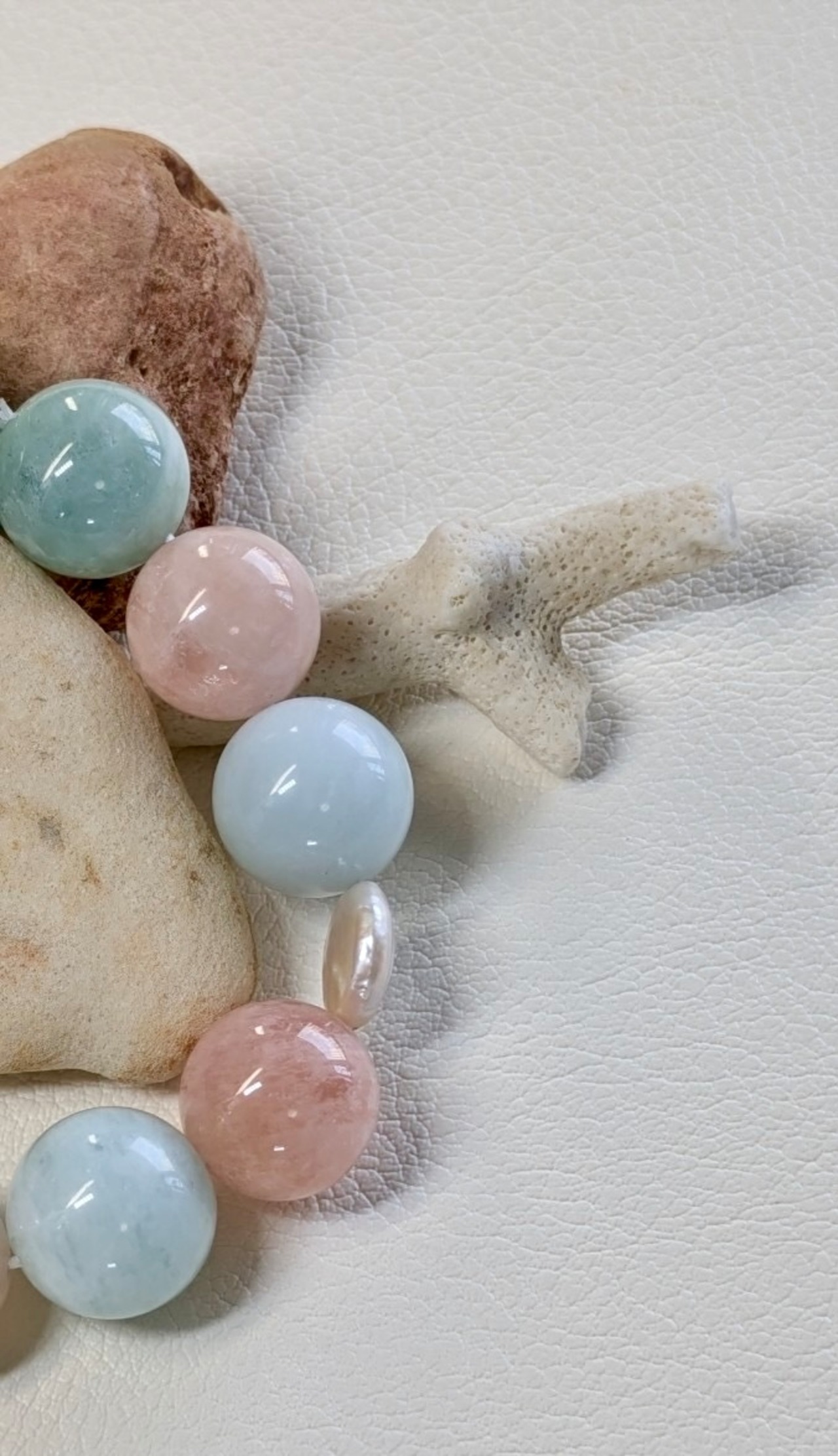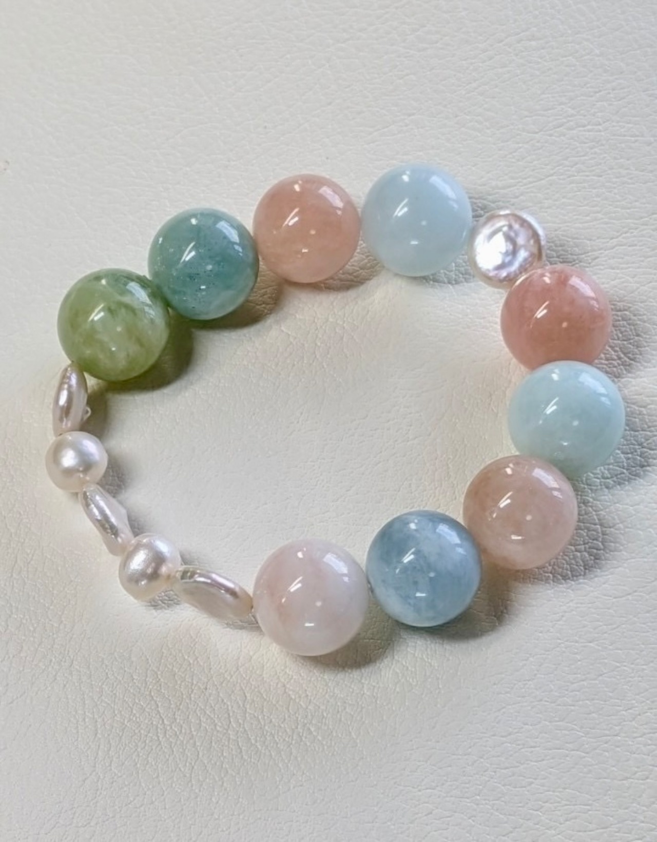 ぜひ、特別な日々に彩りを添えるモルガナイトと淡水パールのブレスレットをお楽しみください。